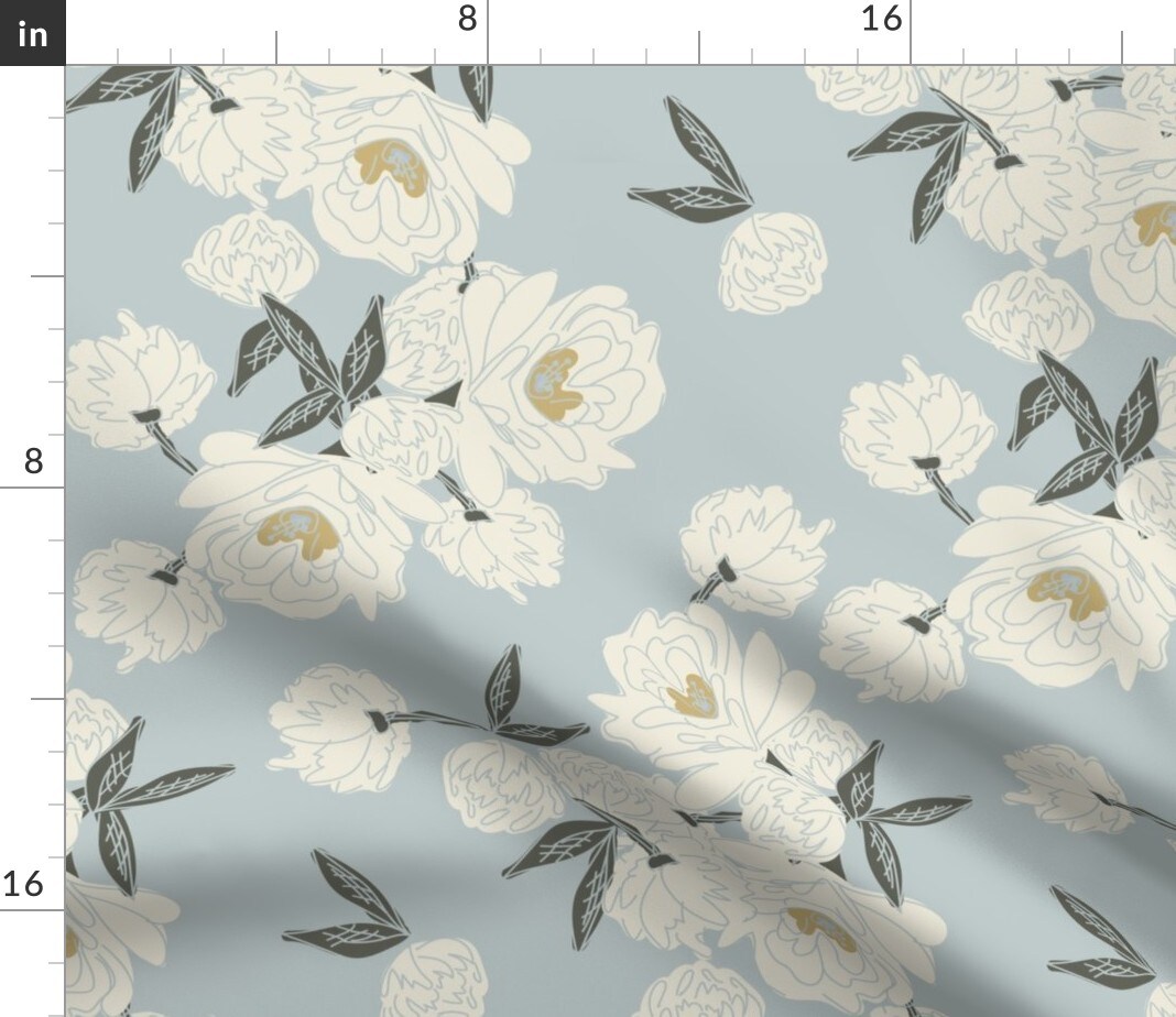 Cream Peonies Light Blue Flowers Floral Garden Botanical Green Handdrawn Cottagecore Custom Printed Fabric by Spoonflower Various Fabrics by the Yard or Fat Quarter