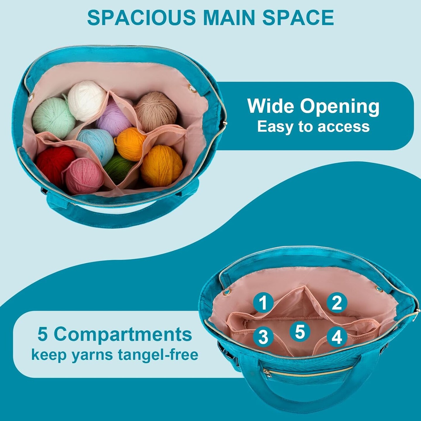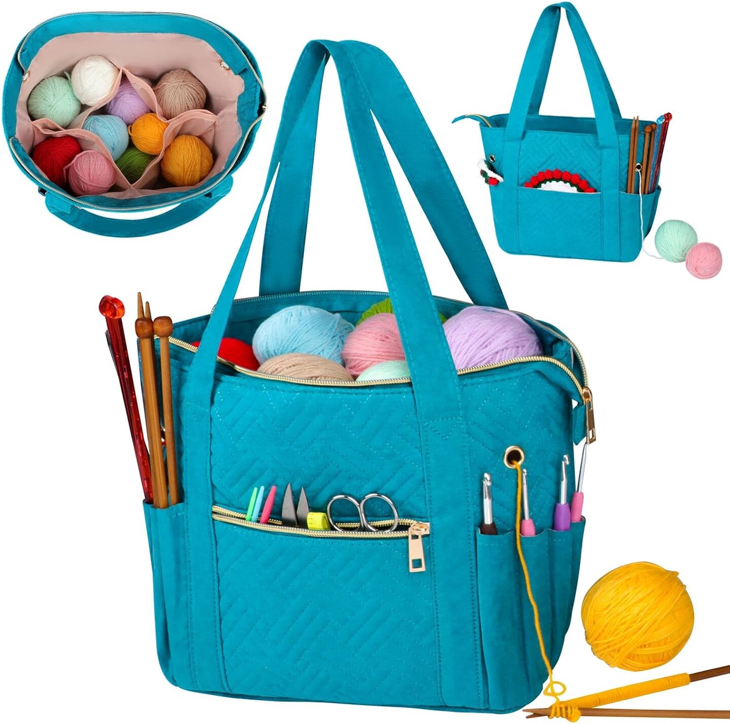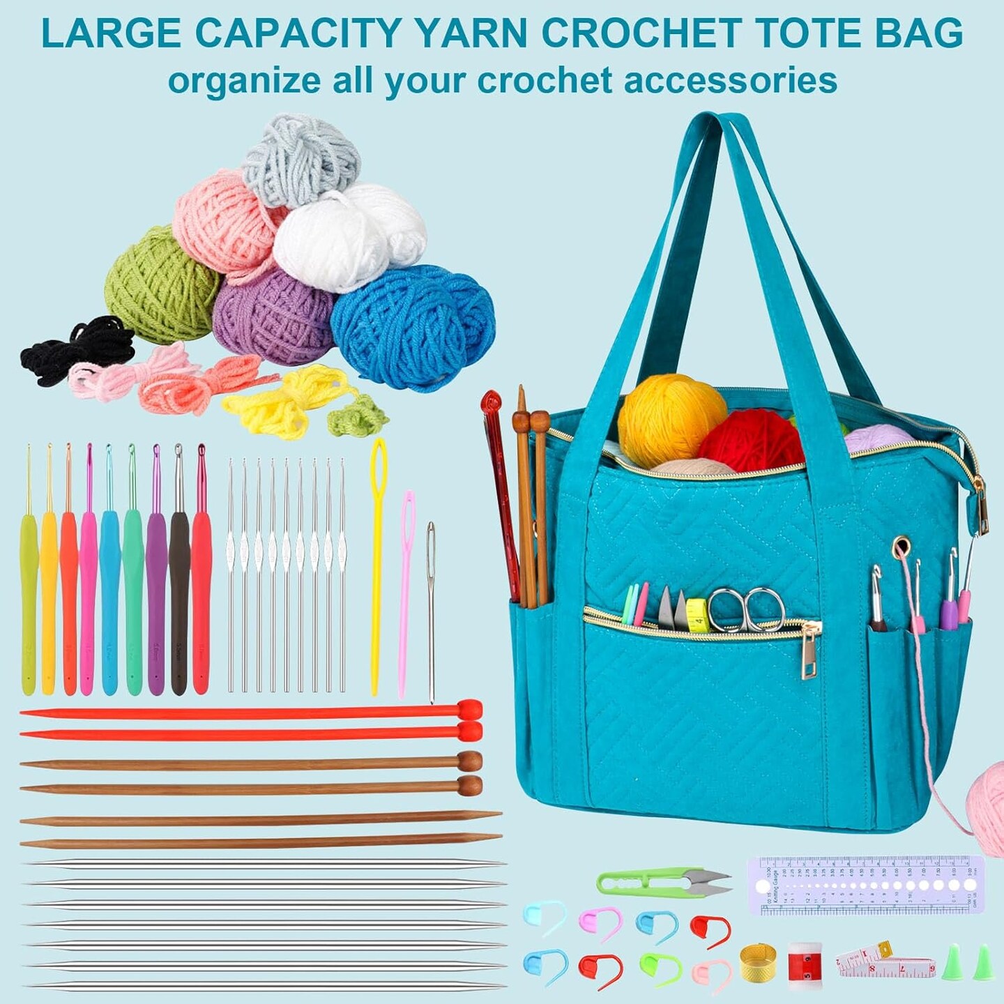 Crochet Bag Organizer for Yarn Storage, Velvet Knitting Tote Bag with Double Handle for Crochet Accessories, Portable Travel Case for Yarn Balls, Crochet Hooks& Knitting Needles Holder (Teal)