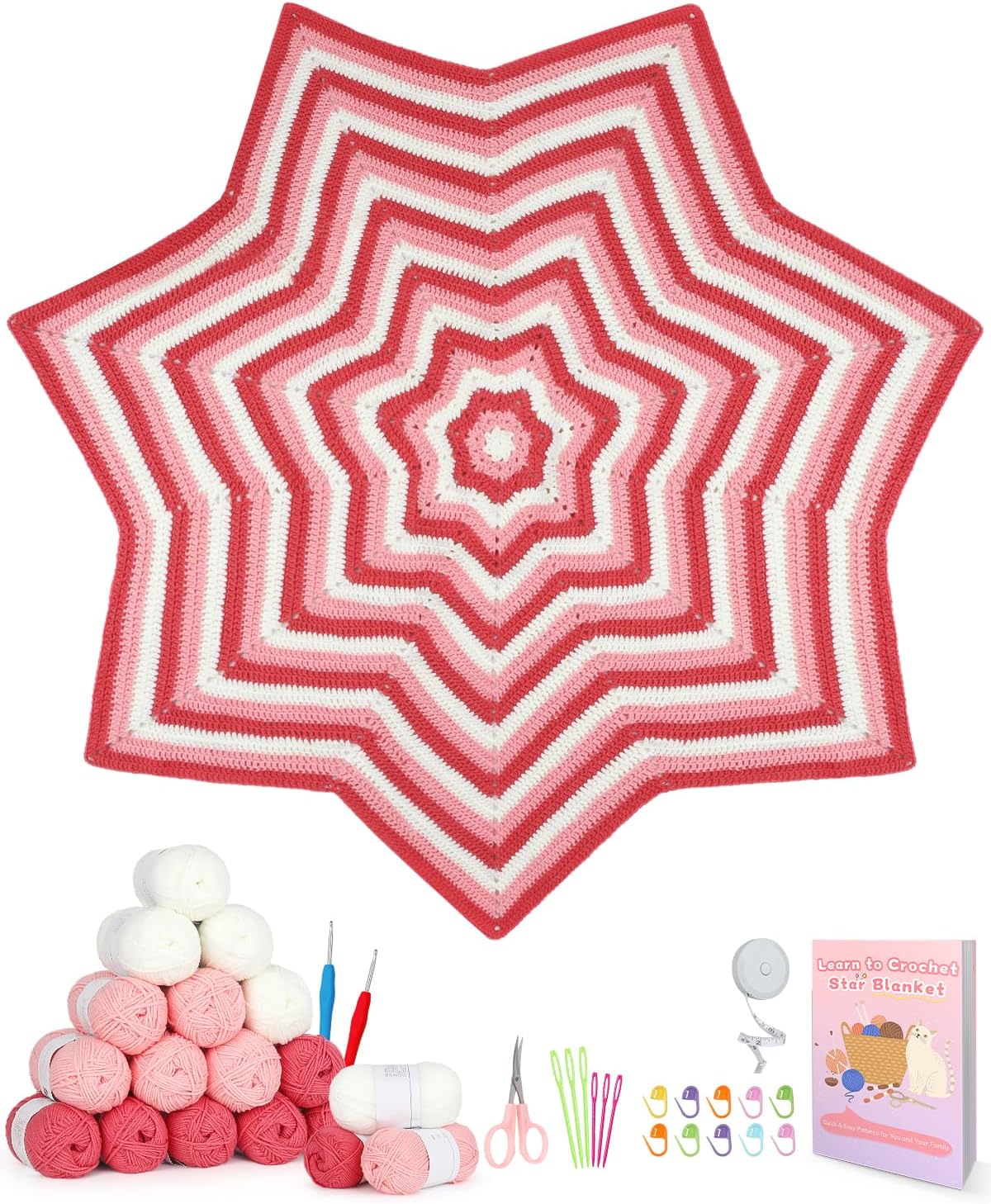 Crochet Granny Square Star Blanket Kits w/Step-by-Step Video Tutorials-Complete Beginner Crocheting Kit for Adults Kids-Easy
