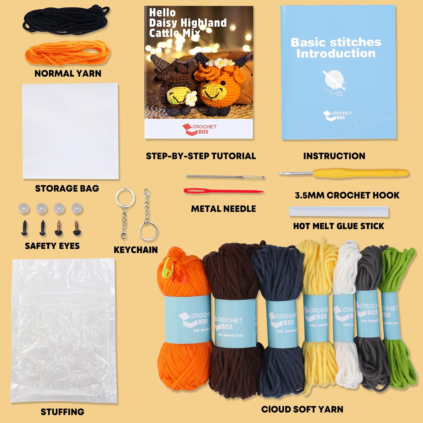 Crochet Kit for Beginners - 2 PCS Highland Cow Keychain Crochet Kit, Learn to Crochet, Include Easy Knitting Yarn, Step-by-Step Video Tutorial, Hook, Holiday Birthday Gift for Adults