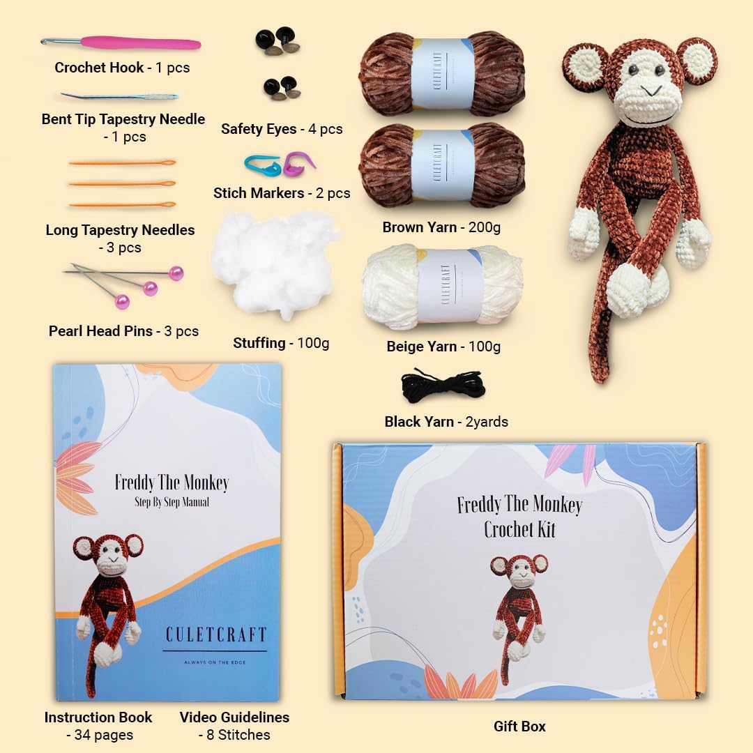 Crochet Kit for Beginners Adults, Freddy The Monkey DIY Crochet Animal Kit for Beginners, Learn to Crochet with Step-by-Step Instruction Book, Beginner Crochet Kit for Adults and Kids