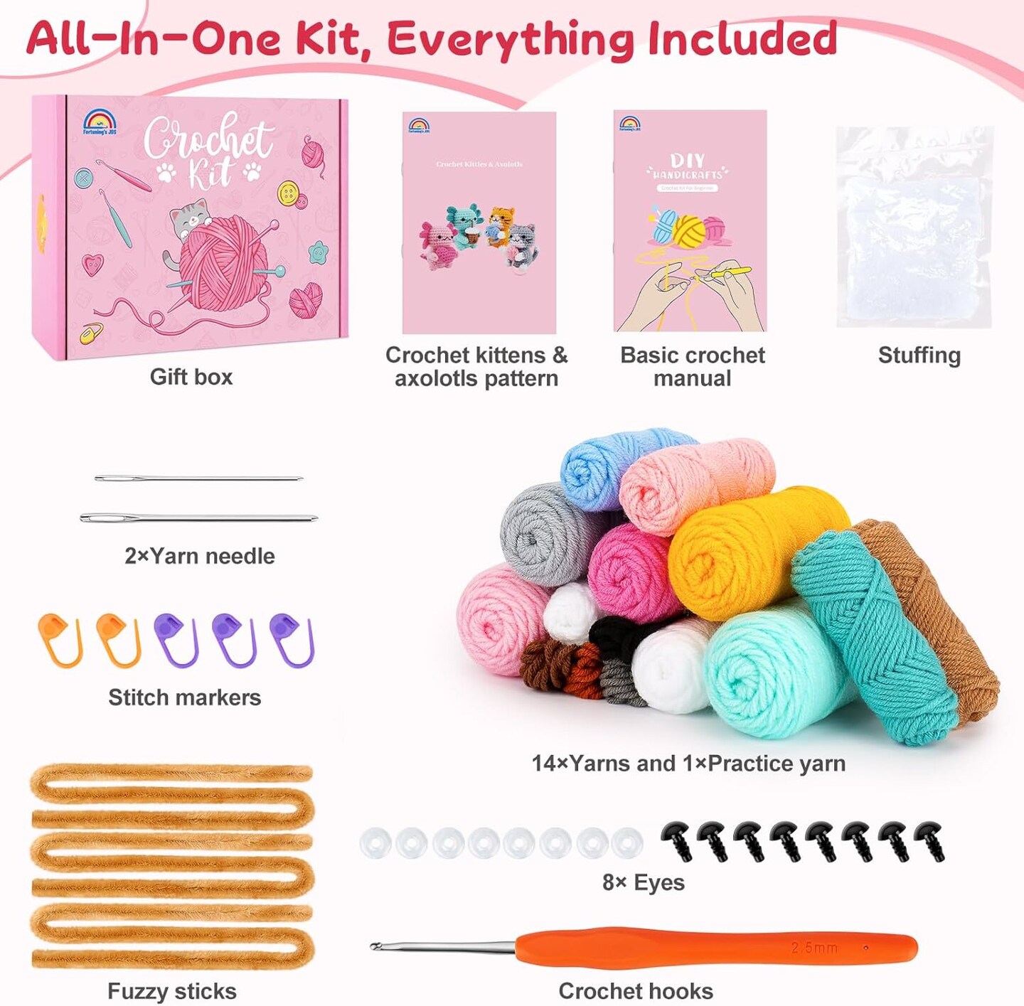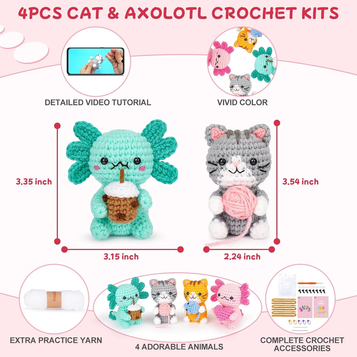 Crochet Kit for Beginners, Axolotls & Cat Crochet Kit for Adults Beginner, Complete Crochet Animals Starter Kit with Step-by-Step Video Tutorials, Easy Knitting Kit Cat Crafts Gifts