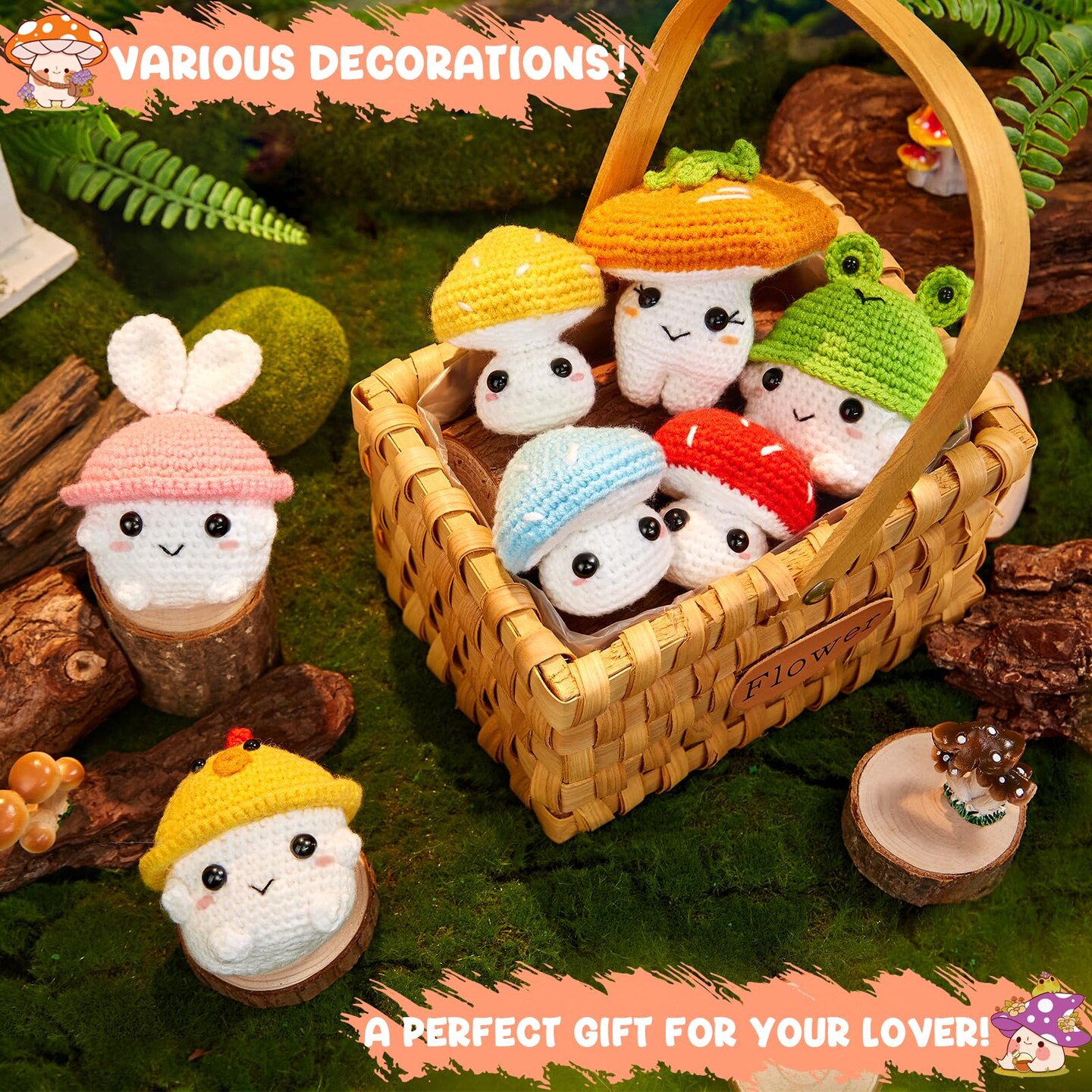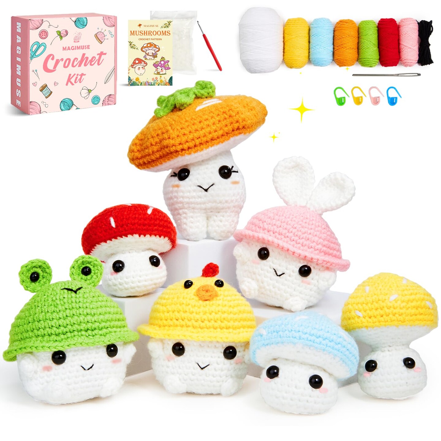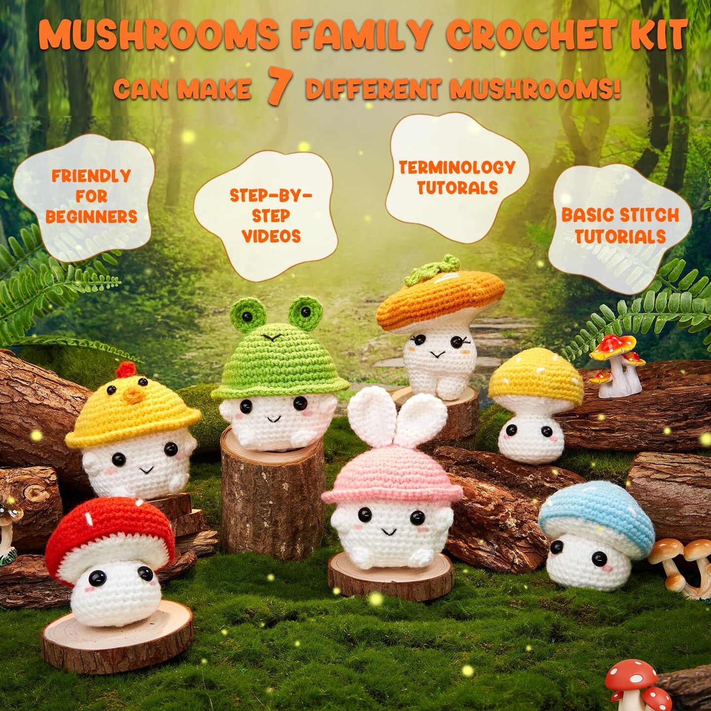 Crochet Kit for Beginners, Crochet Starter Kits for Adults Amigurumi Craft Knitting Crocheting Kits with Step-by-Step Video Tutorials, Mushroom Family(40%+ Yarn