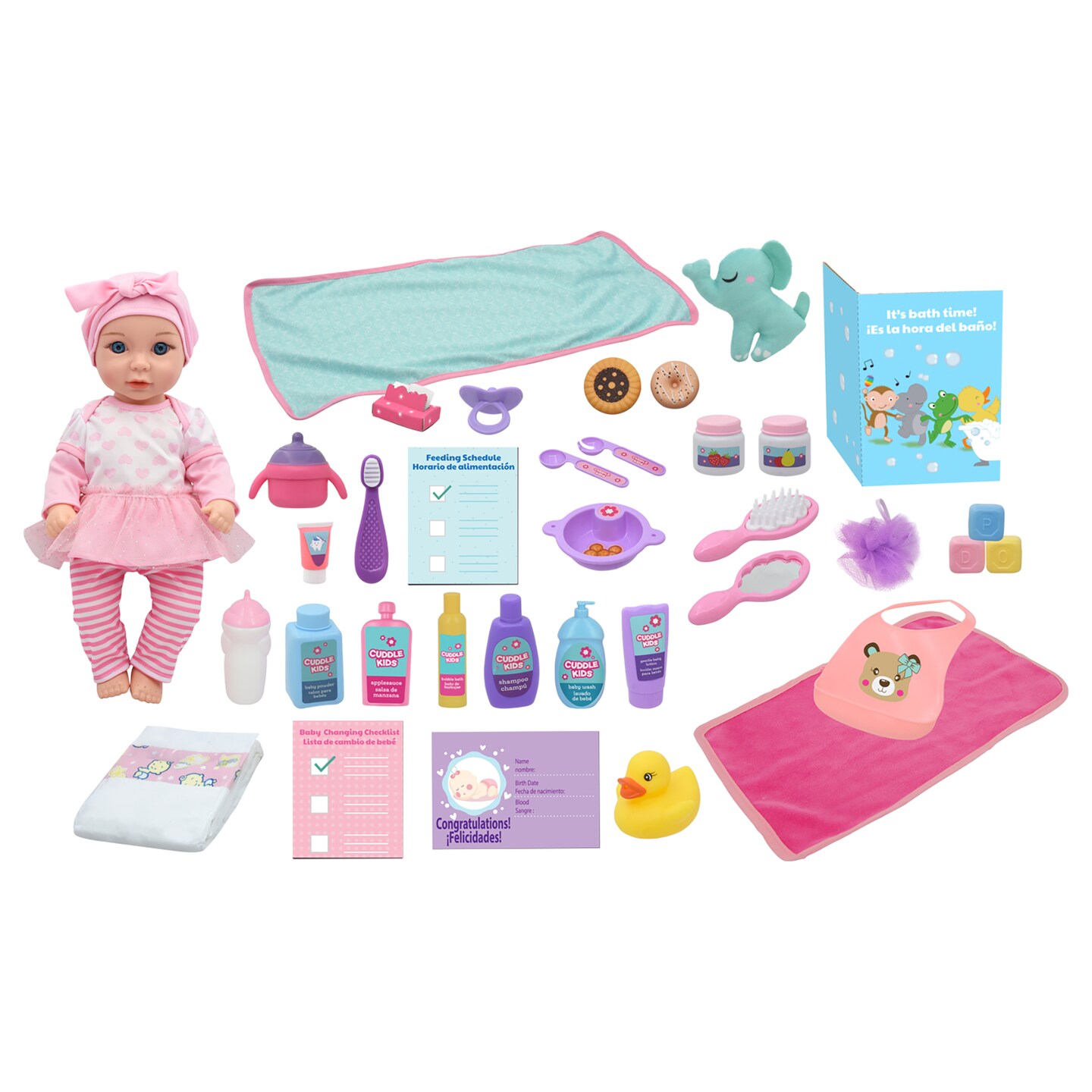 Cuddle Kids: Love N' Feed Playset - 15" Baby Doll - Pink Tutu Outfit - Cuddly Elephant Plush, 33pc Care Toy Accessories, Hard Body, Kids Age 3+