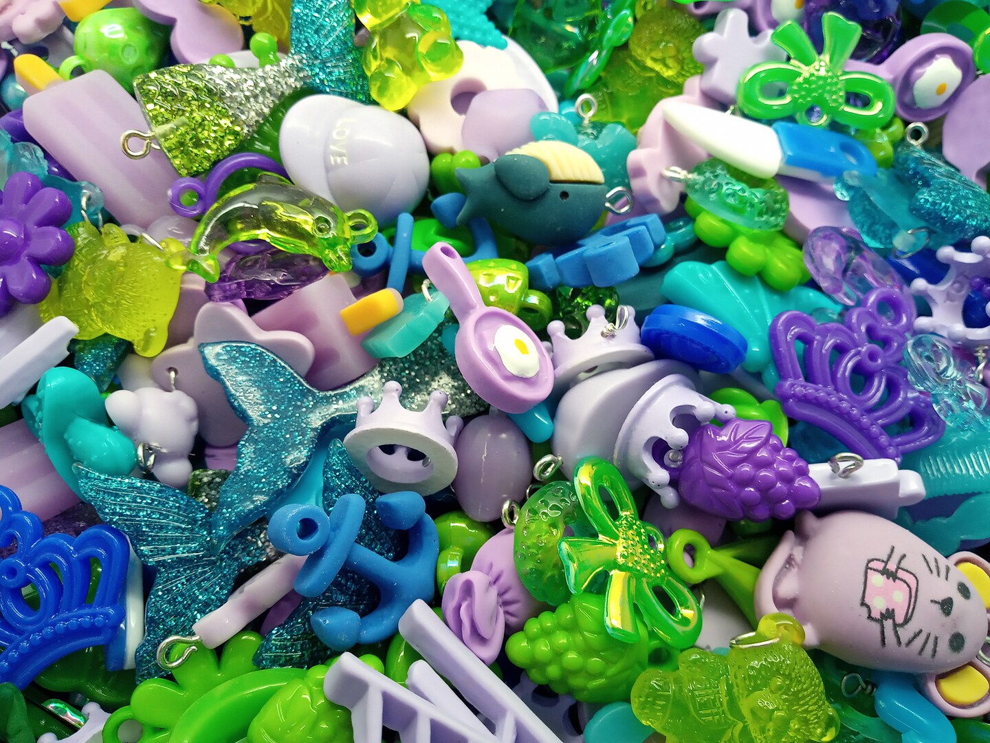 Cute Charm Mix in Blue Green & Purple, 30 pieces, Flatback Resin and Acrylic Mix, Adorabilities
