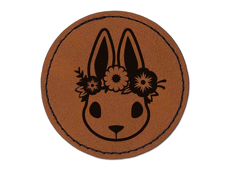 Cute Easter Bunny Rabbit Head with Flower Crown Round Iron-On Engraved Faux Leather Patch Applique - 2.5"
