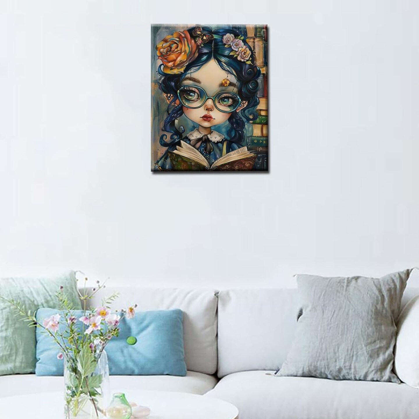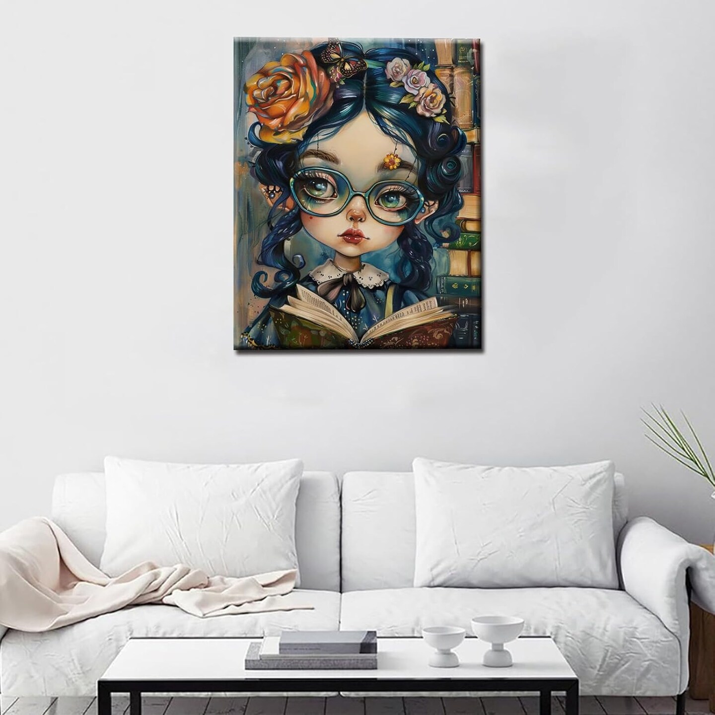 Cute Girl Wearing Glasses DIY Paint by Numbers,Student Reading Book Oil Canvas Painting Kit for Kids & Adults,16X20 inches Graffitic Library Scene Paintwork Acrylic Pigment,Home Decor(Frameless)