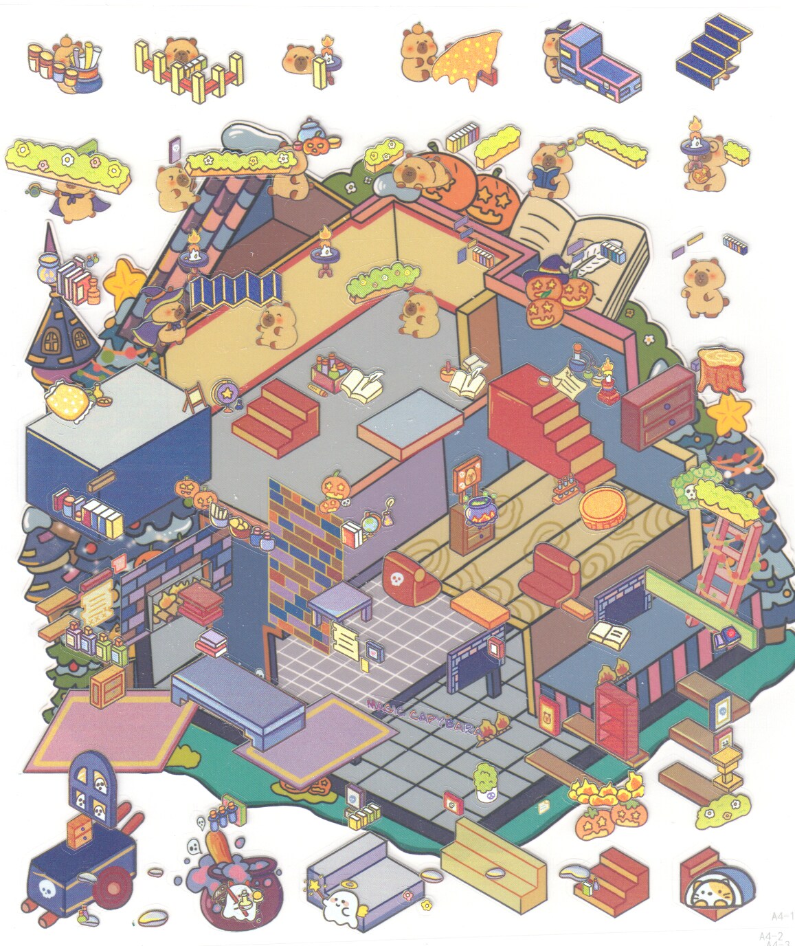 Cute Halloween Isometric Stickers, Capybara Party Room Scene, Large Size, Adorabilities