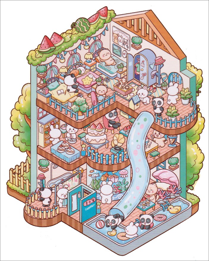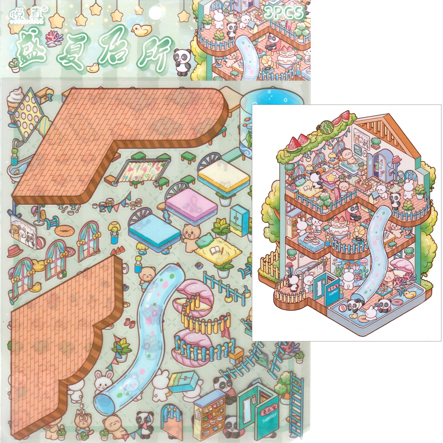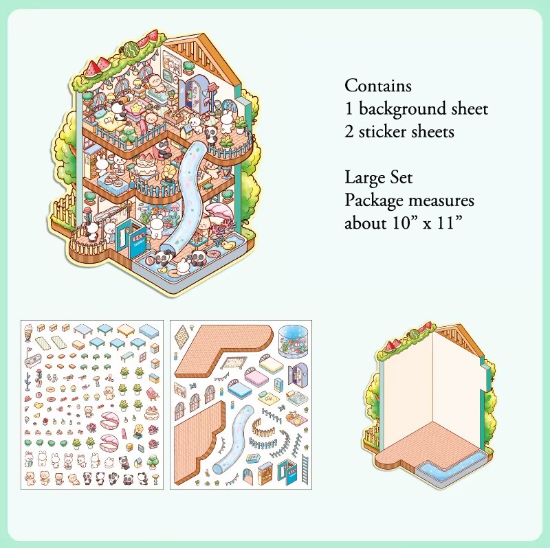 Cute Panda & Rabbit House Sticker Scene, Large Size, Isometric Sticker Activity, Adorabilities