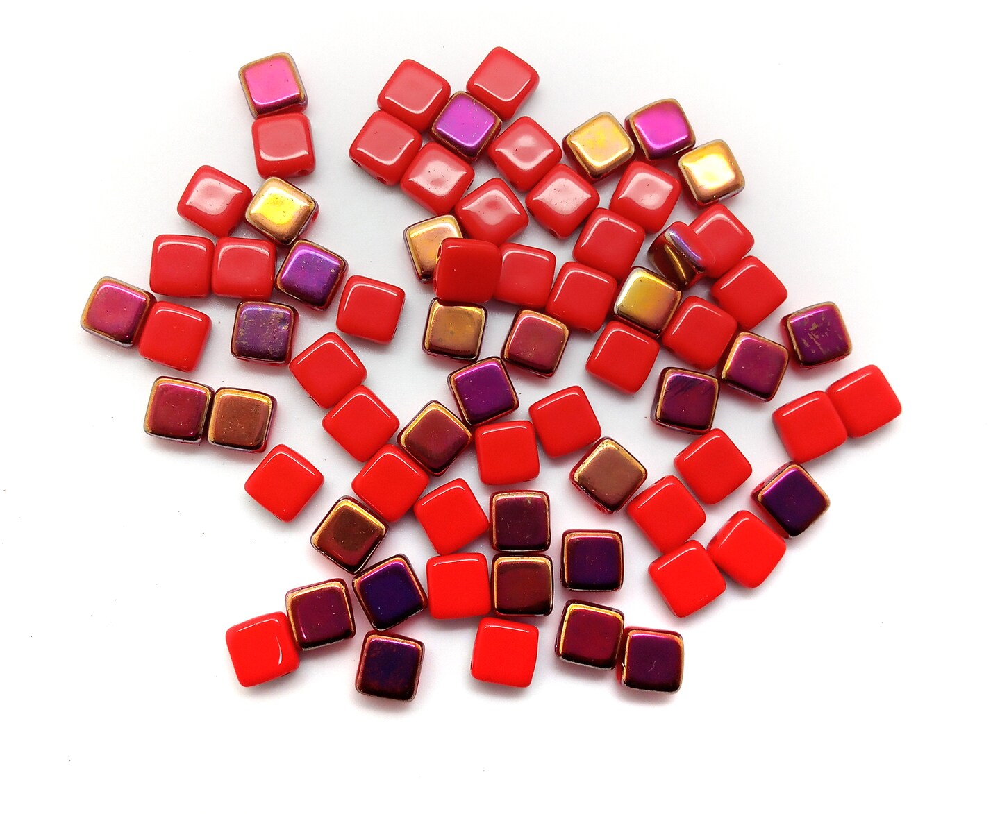 Czech Glass Tile Beads, 50 pc, 6mm Two-tone Red & Metallic, Adorabilities