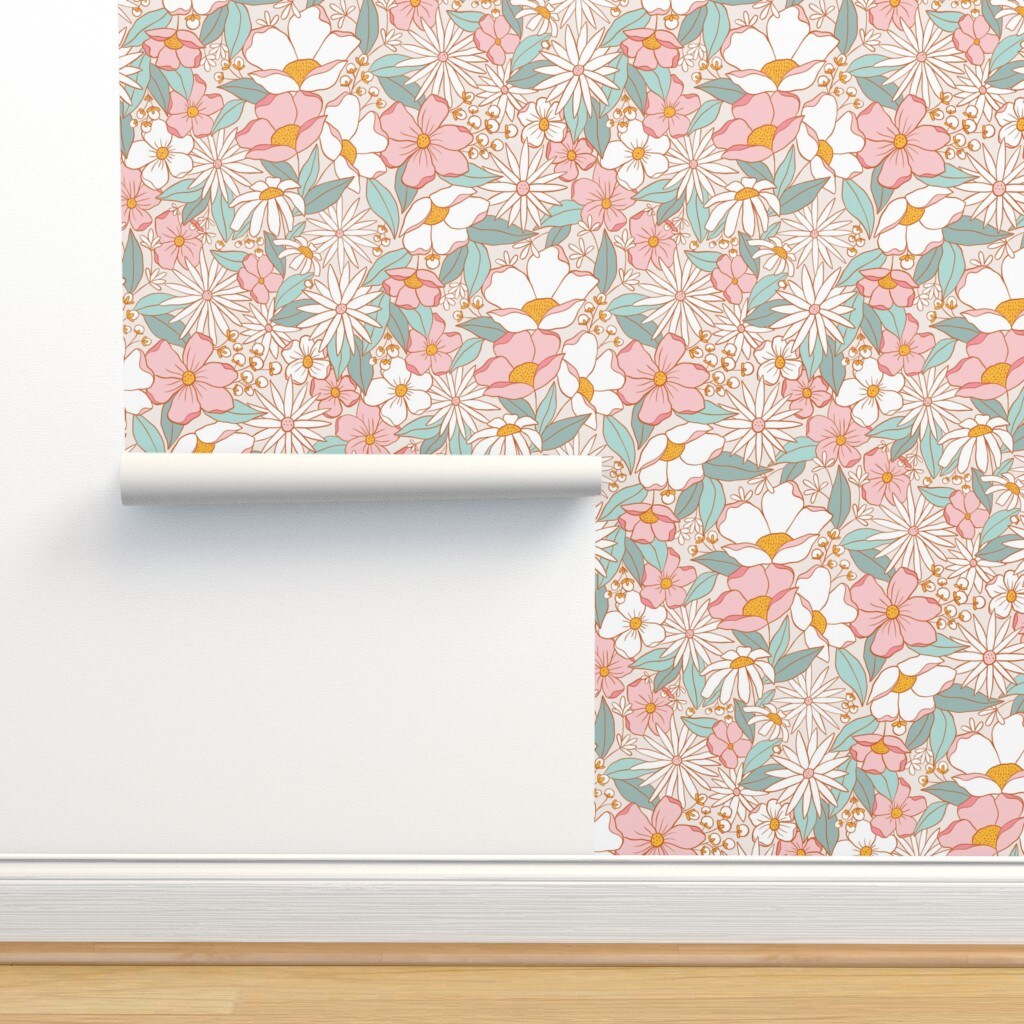Daisy Botanical Anemone Pink Teal Beige Jumbo Scale Spring Garden Custom Pre-pasted Wallpaper by Spoonflower Pre-Pasted Wallpaper 2FT Wide