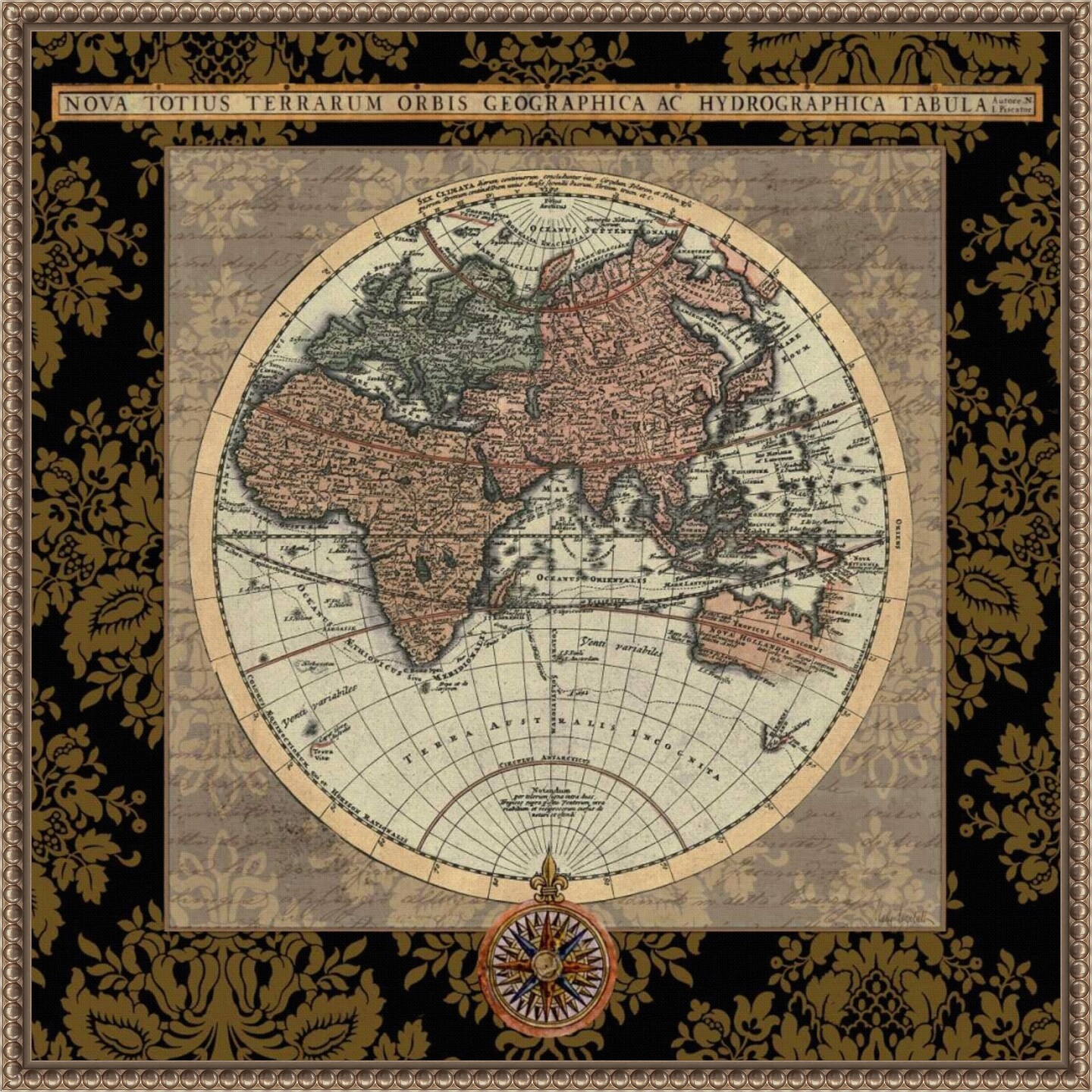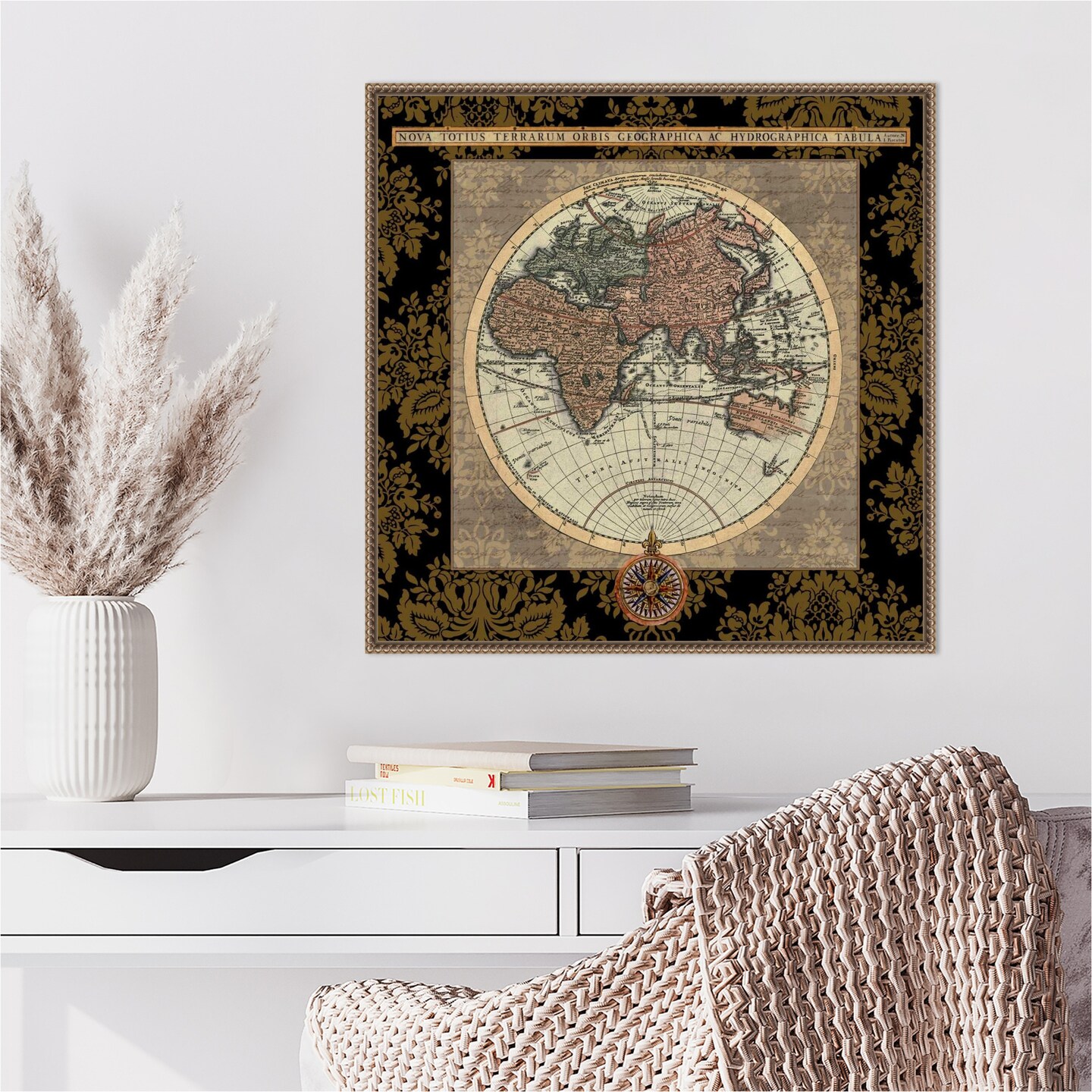 Damask on Black Map I by Elizabeth Medley 22-in. W x 22-in. H. Canvas Wall Art Print Framed in Bronze
