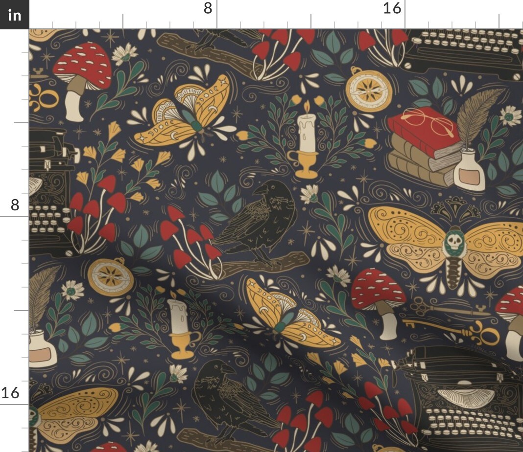 Dark Academia Moth Raven mushrooms Feather Candle Moody Typewriter Goth Gothcore Red Yellow Black Teal Navy Custom Printed Fabric by Spoonflower Various Fabrics by the Yard or Fat Quarter