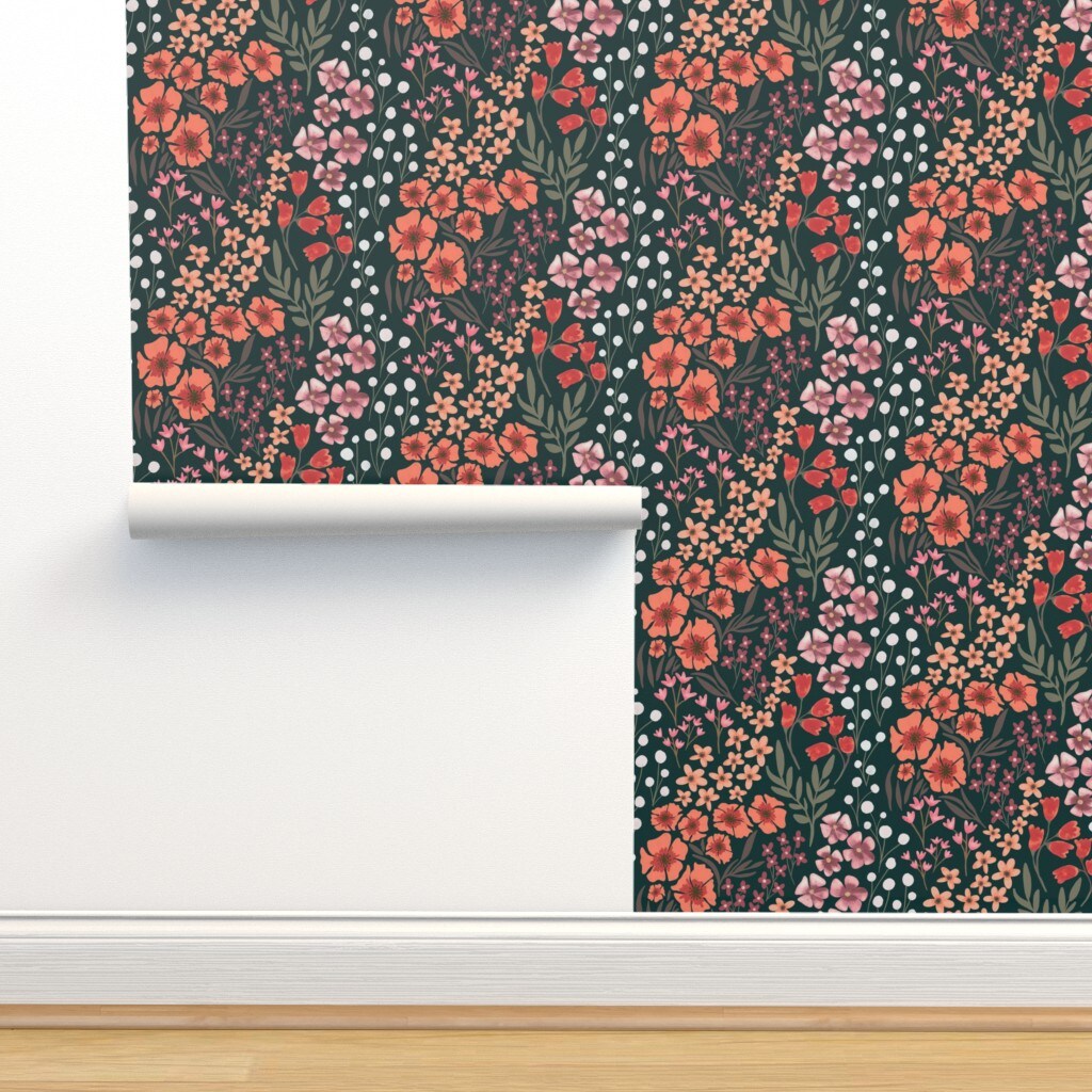 Dark Floral Botanical Garden Delicate Romantic Graceful Green Coral Orange Custom Pre-pasted Wallpaper by Spoonflower Pre-Pasted Wallpaper 2FT Wide