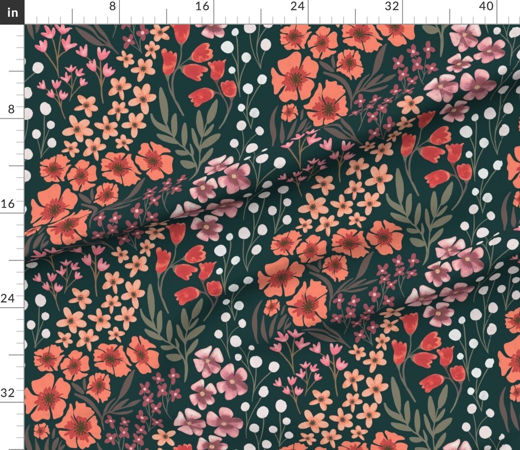 Dark Floral Botanical Garden Delicate Romantic Graceful Green Coral Orange Custom Printed Fabric by Spoonflower Various Fabrics by the Yard or Fat Quarter