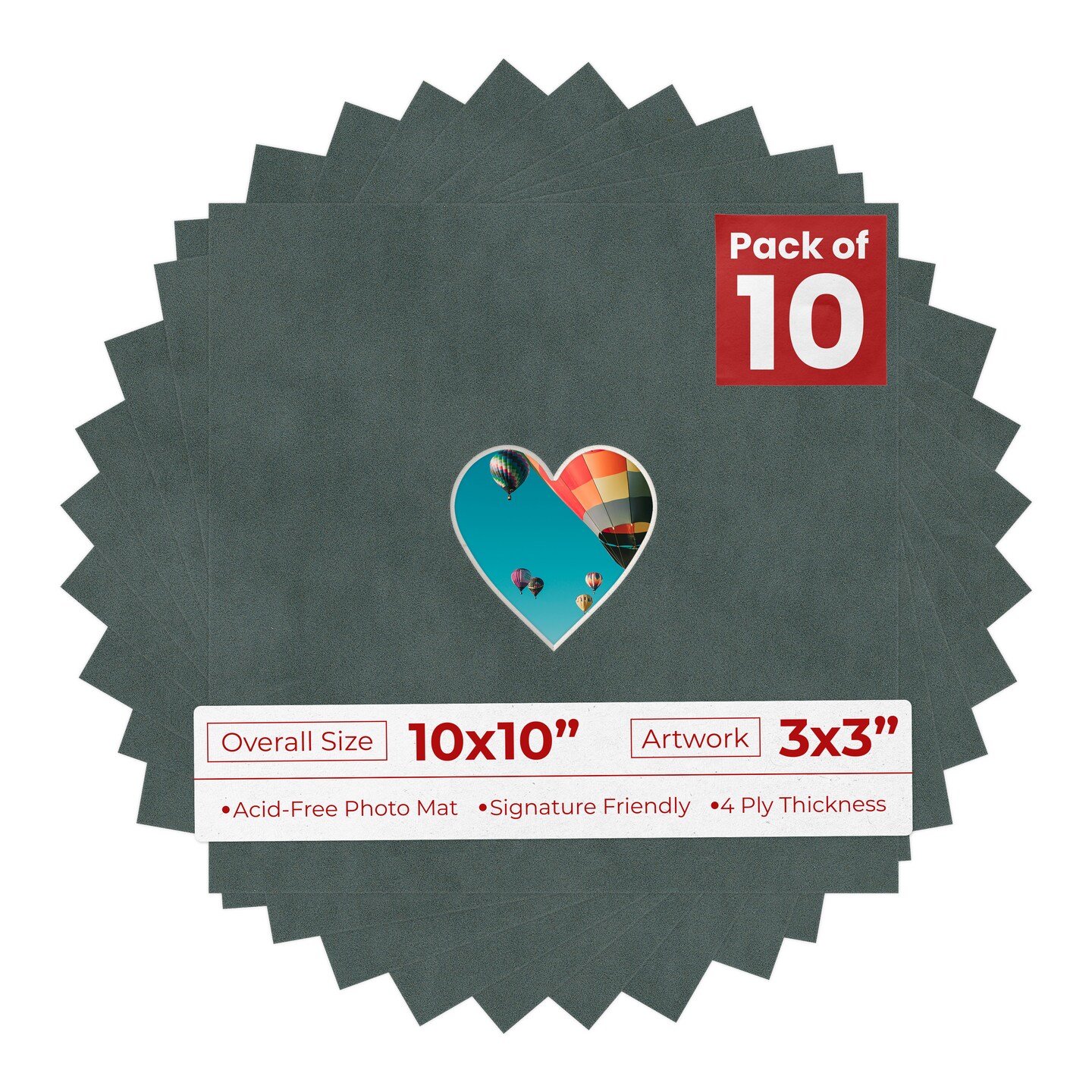 Dark Grey Suede Mat Board for 10x10 Frames - Heart Opening for 3x3 Photos