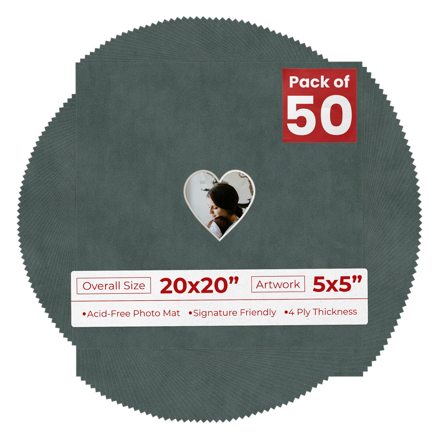 Dark Grey Suede Mat Board for 20x20 Frames - Heart Opening for 5x5 Photos