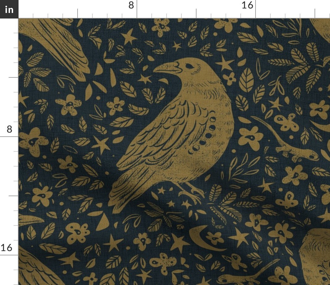 Dark Raven Gothic Floral Crow Corvid Witchy Boho Crescent Moon Lunar Cycle Faded Gold Custom Printed Fabric by Spoonflower Various Fabrics by the Yard or Fat Quarter