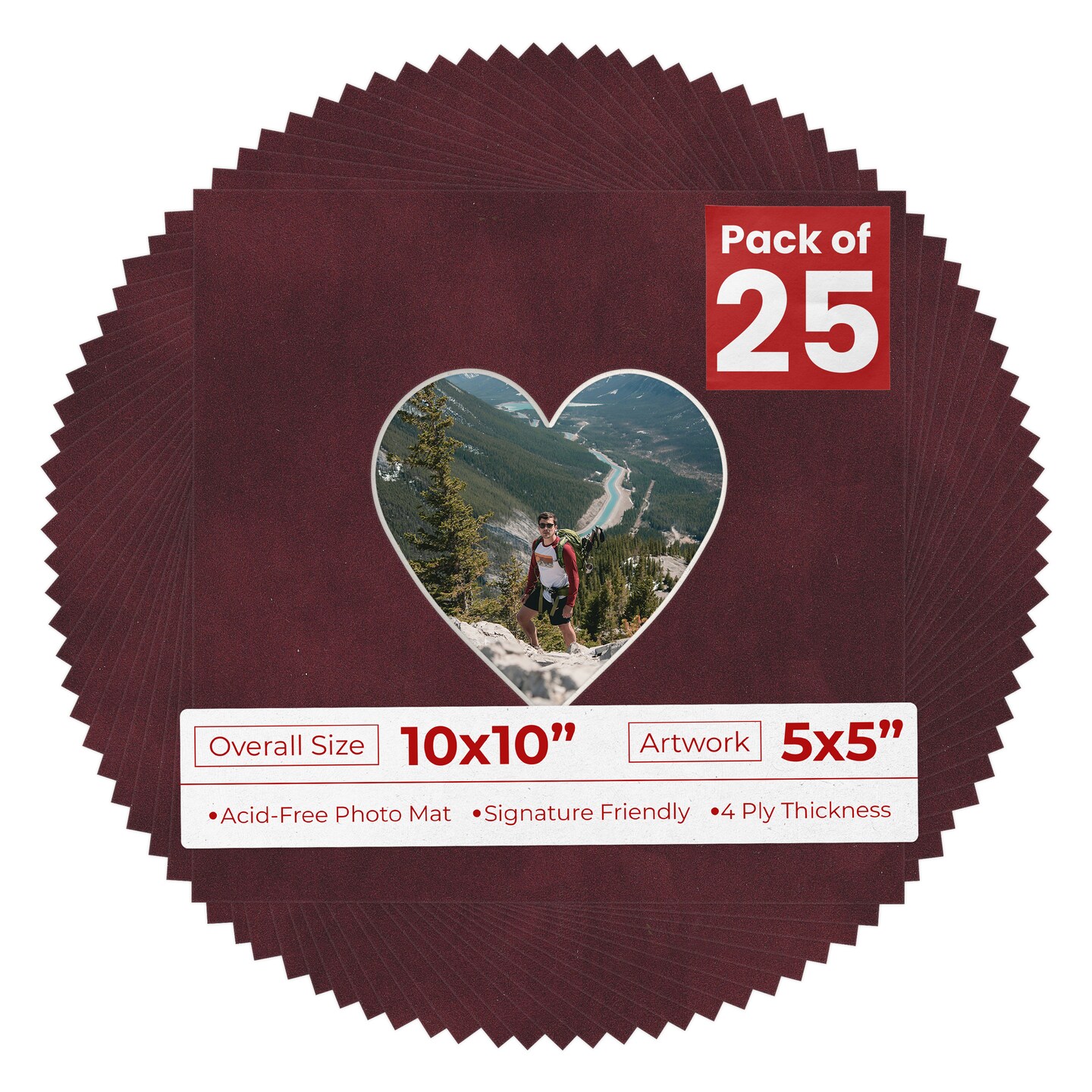 Dark Red Suede Mat Board for 10x10 Frames - Heart Opening for 5x5 Photos