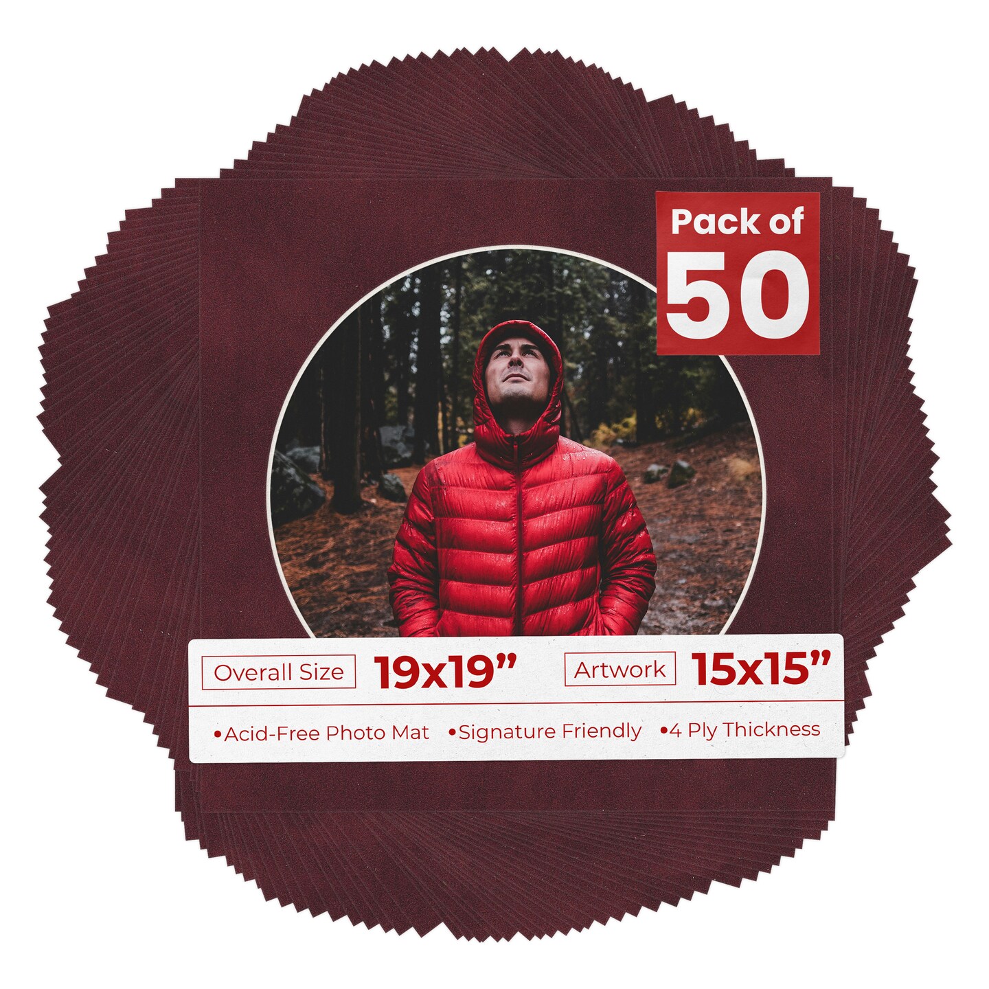 Dark Red Suede Mat Board for 19x19 Frames - Circle Opening for 15x15 Photos