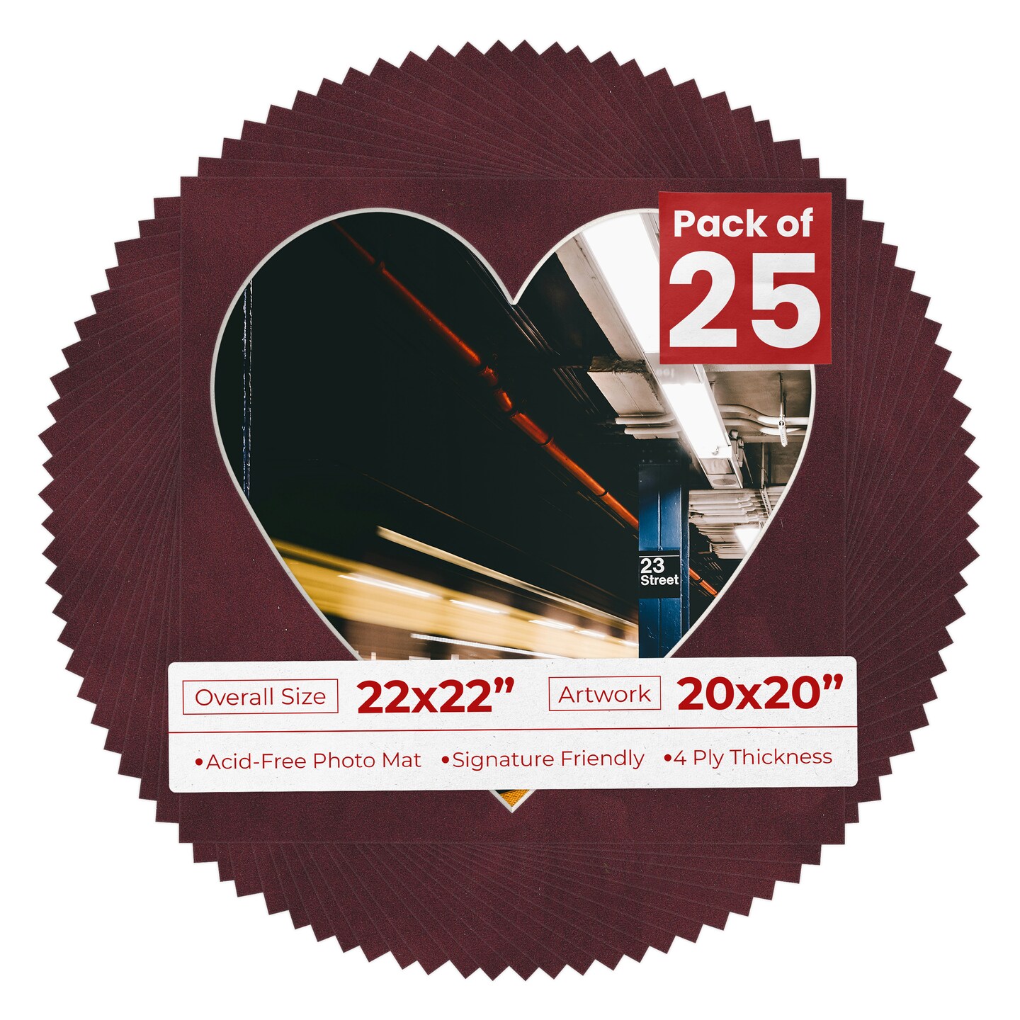 Dark Red Suede Mat Board for 22x22 Frames - Heart Opening for 20x20 Photos