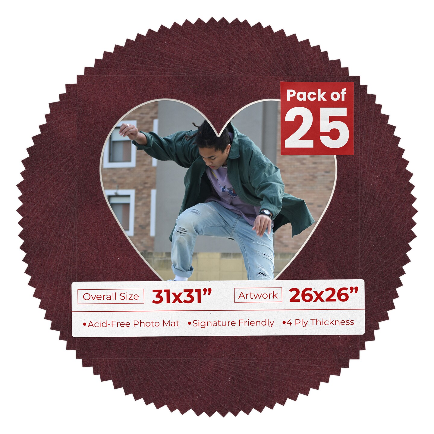 Dark Red Suede Mat Board for 31x31 Frames - Heart Opening for 26x26 Photos