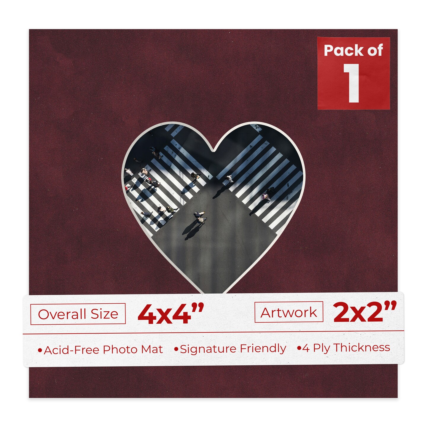 Dark Red Suede Mat Board for 4x4 Inch Frames - Heart Opening for 2x2 Photos