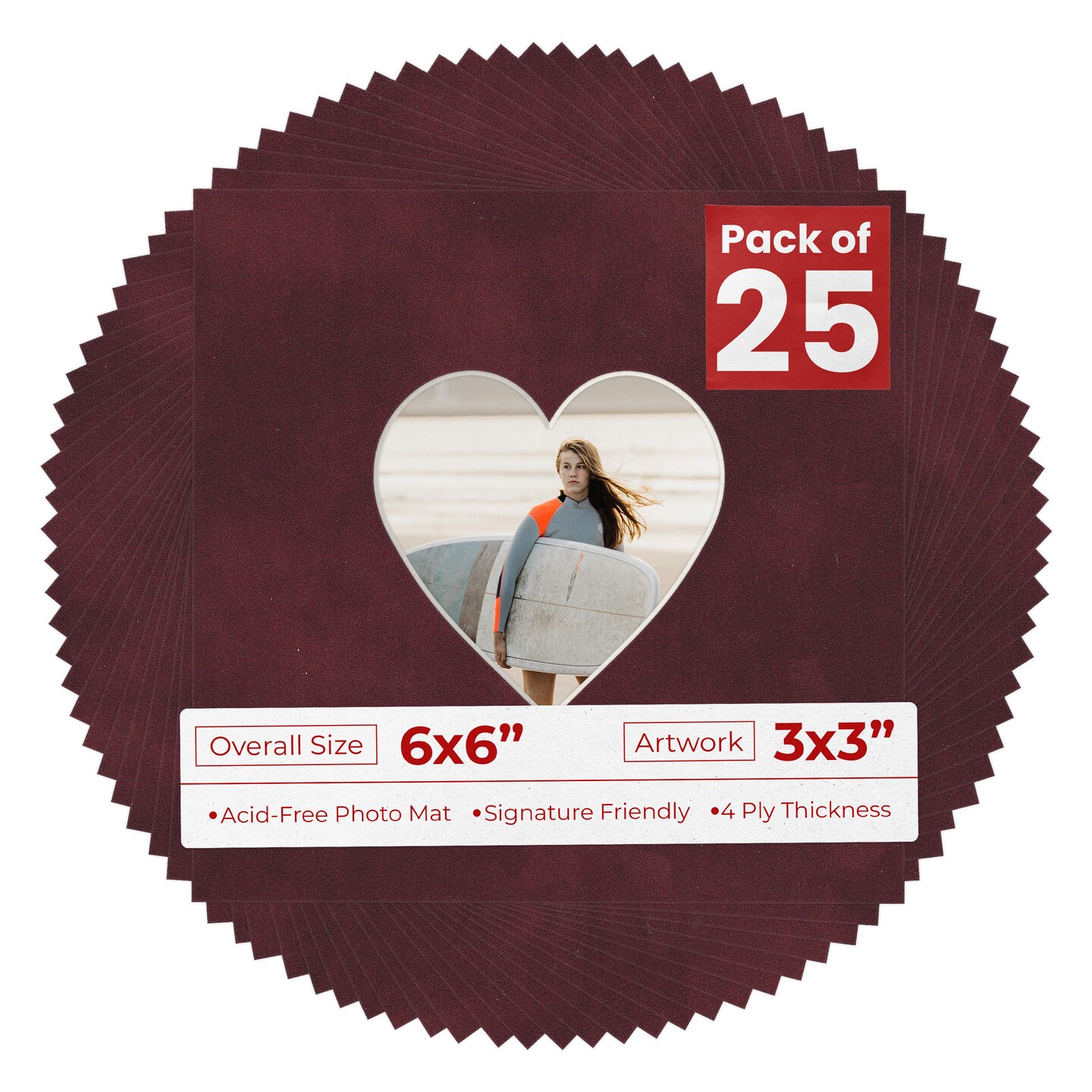 Dark Red Suede Mat Board for 6x6 Frames - Heart Opening for 3x3 Photos