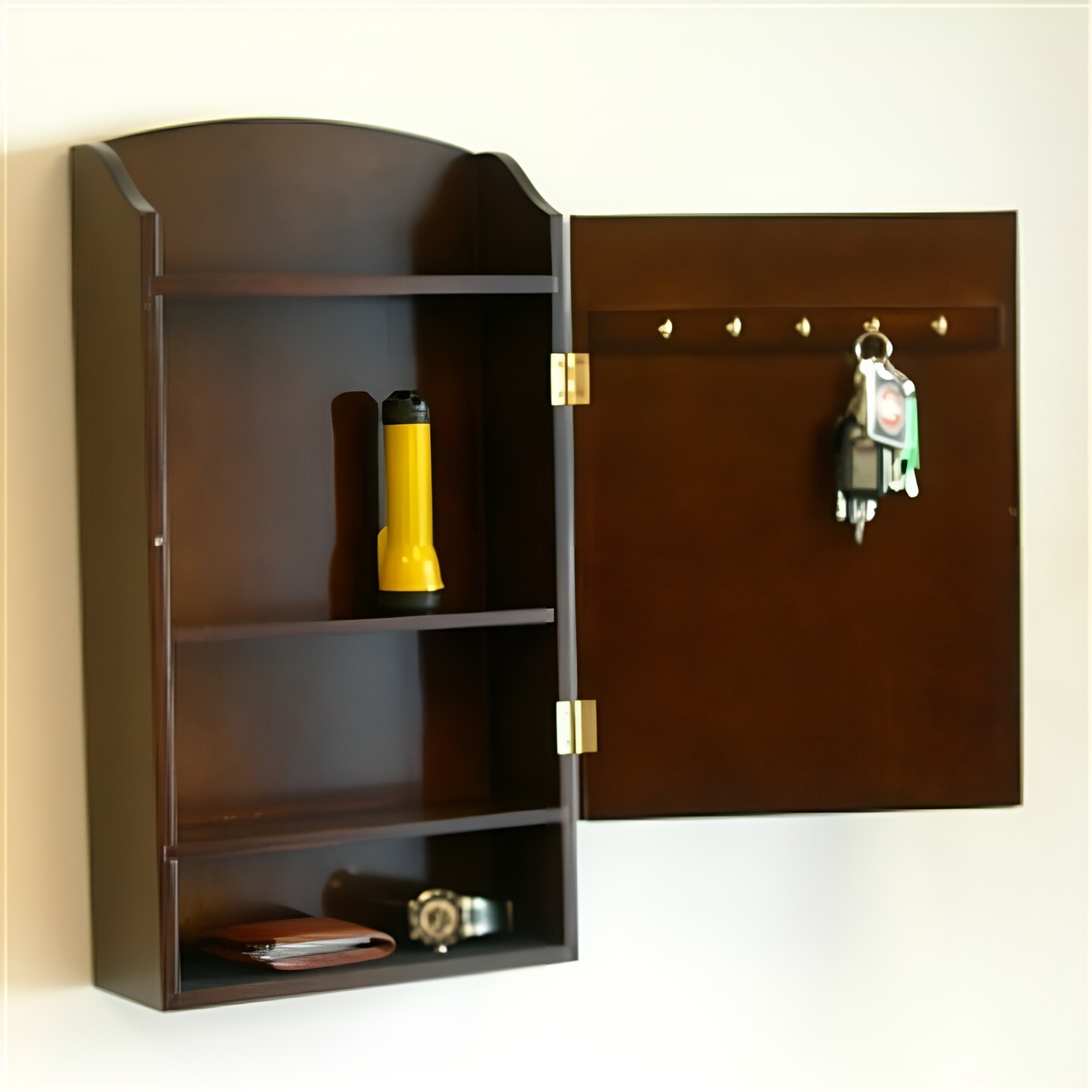 Dark Walnut Wall Mount Mail Organizer with Key Hooks and Adjustable Shelf