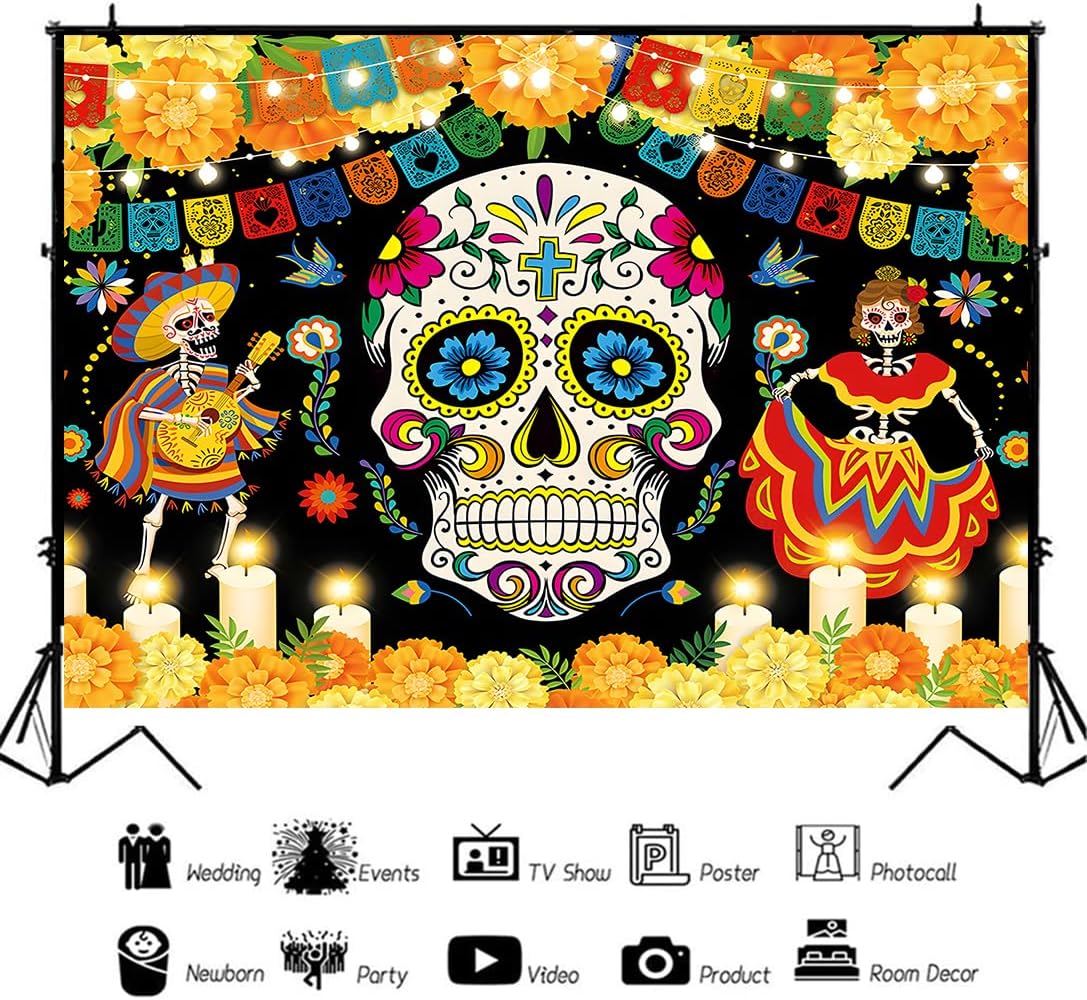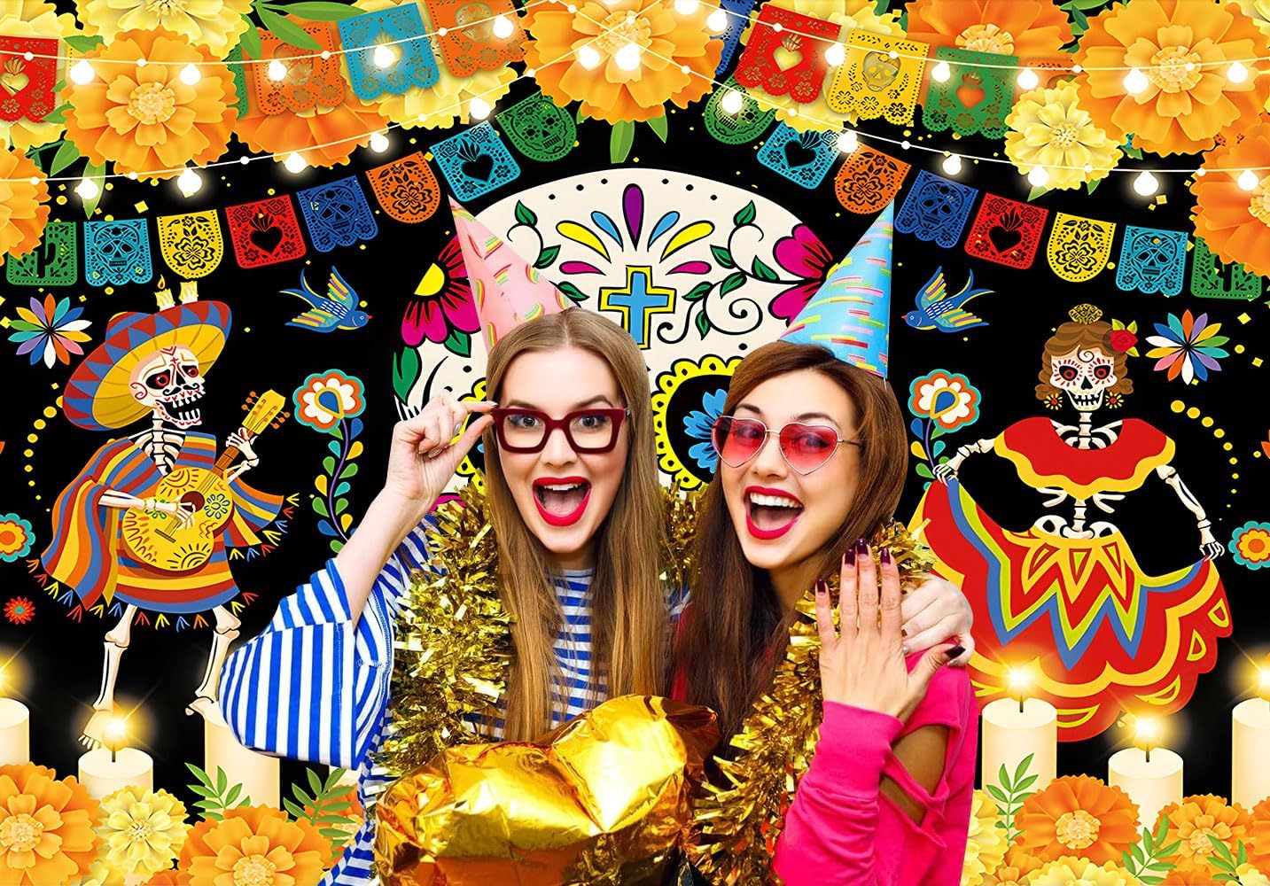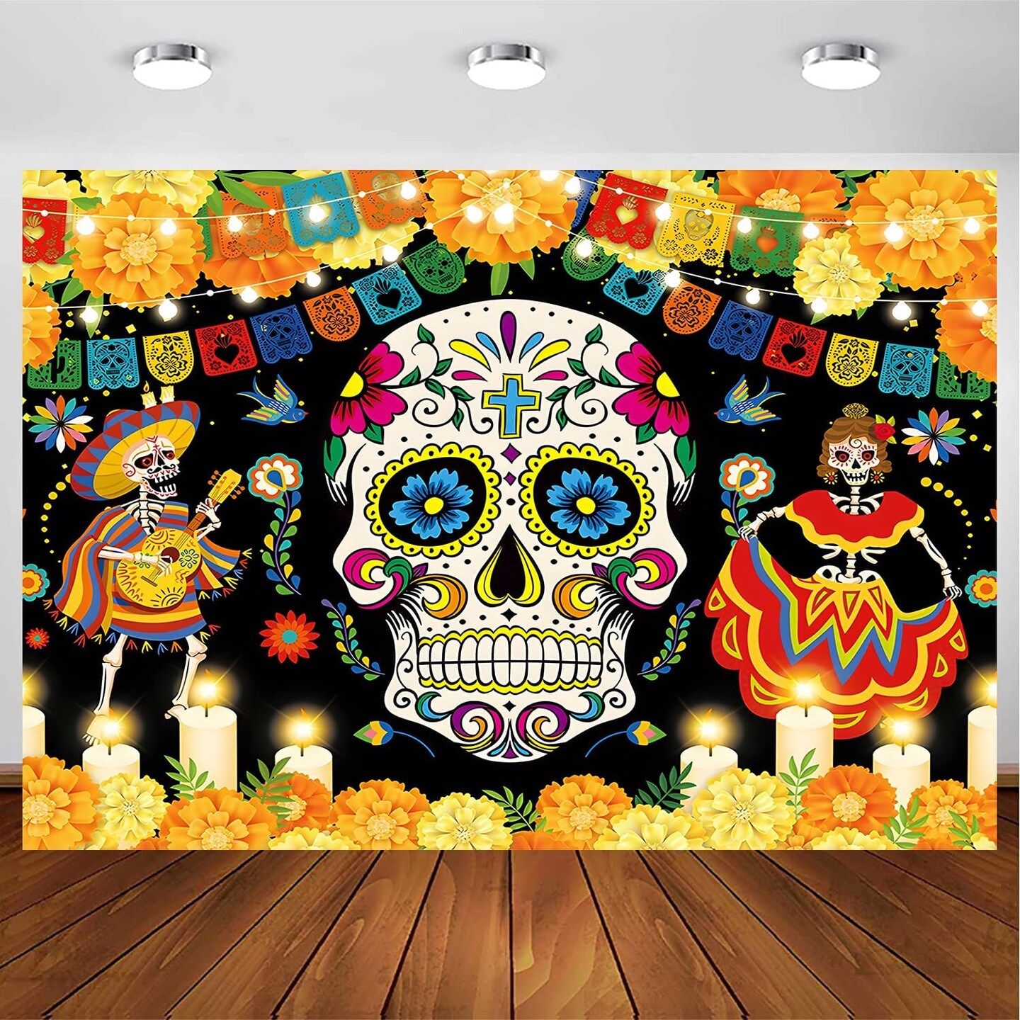 Day of The Dead Backdrop Mexican Fiesta Sugar Skull (Red, Marigold)