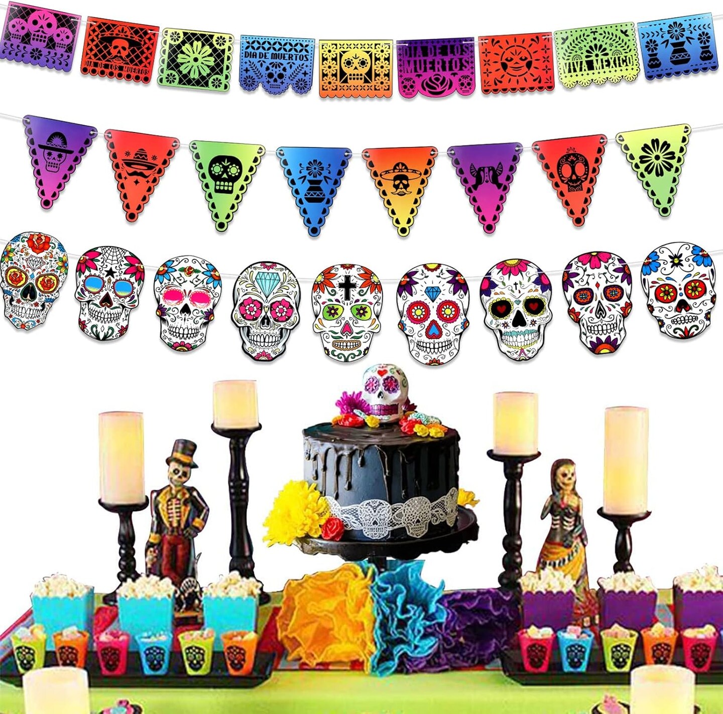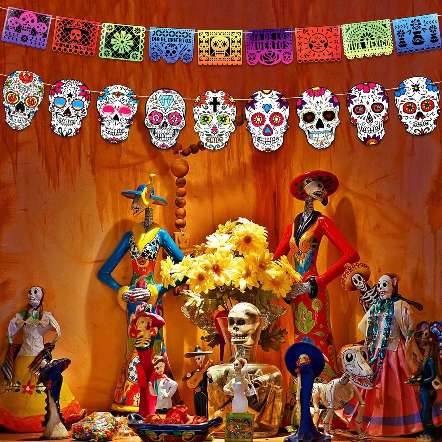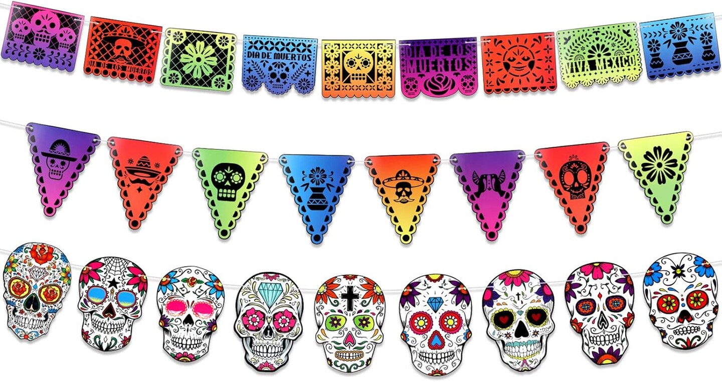 Day of The Dead Decorations, Dia De Los Muertos Pennant Banner for Day of The Dead Party Supplies, Sugar Skull Bunting Banner Papel Picado Backdrop Garland for Mexican Themed Birthday Party