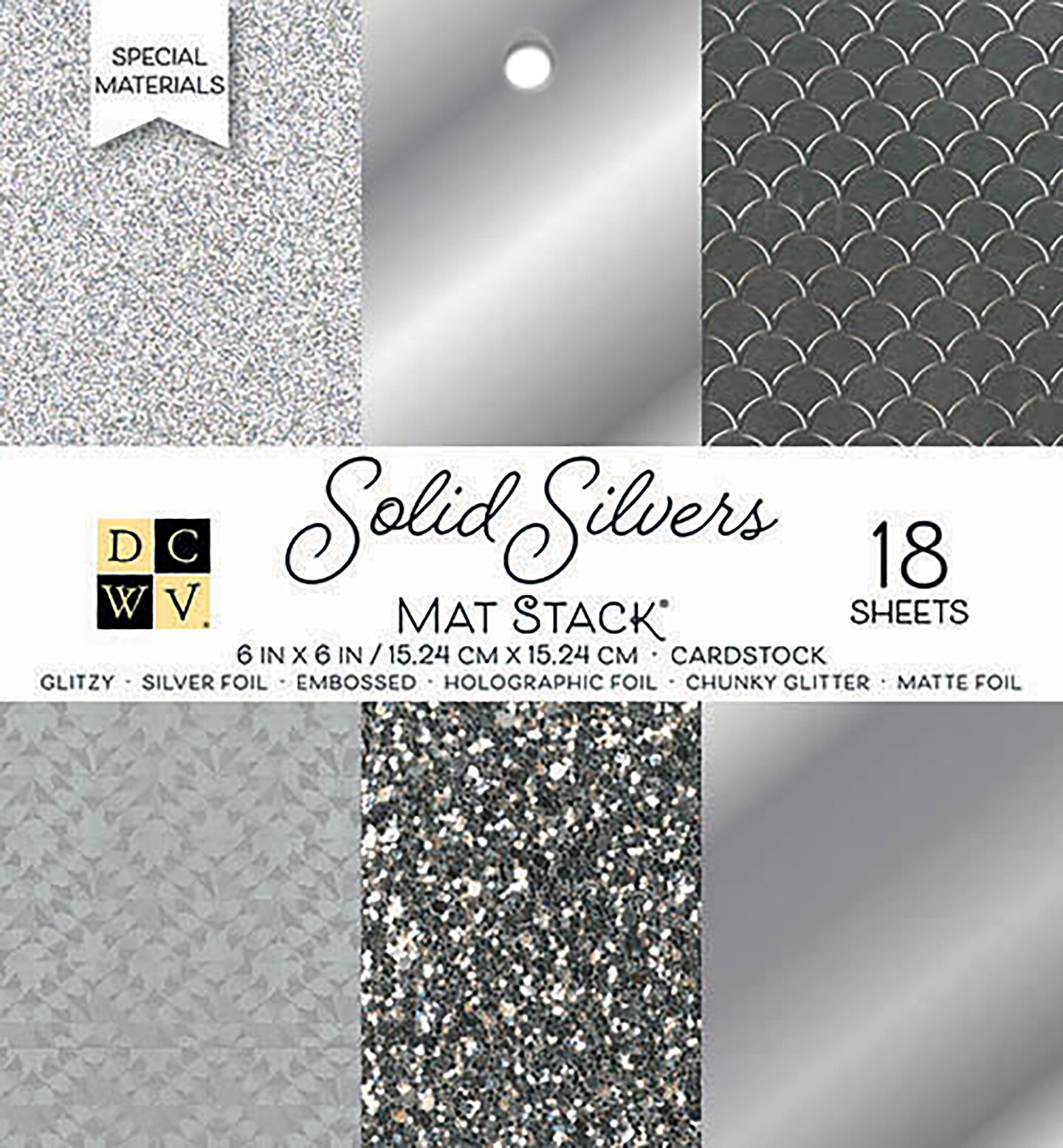 DCWV Single-Sided Cardstock Stack 6"X6" 18/Pkg-Solid Silvers Glitter & Foil, 6 Designs