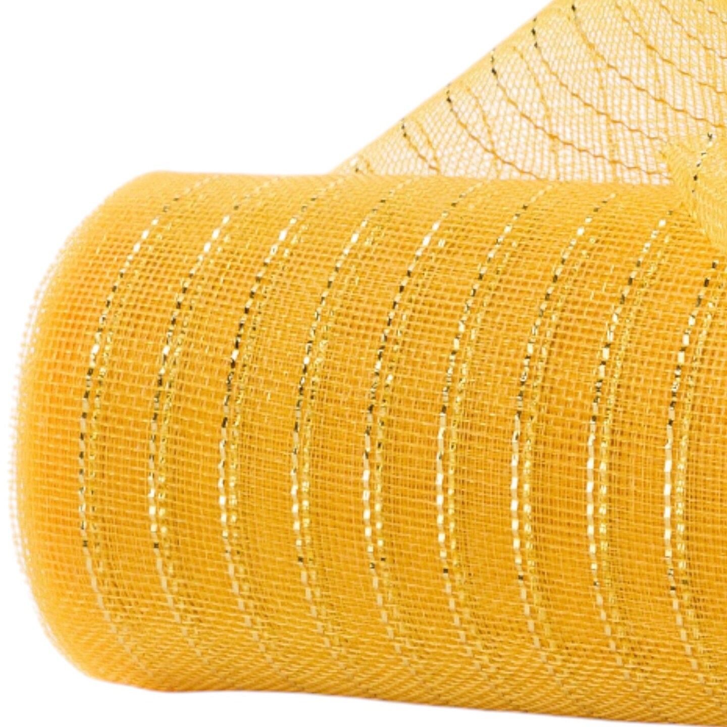 Deco Mesh: 10.25" Bright Yellow Fine Weave Mesh with Gold Foil for Wreaths, Bows, Crafts, and Decorations