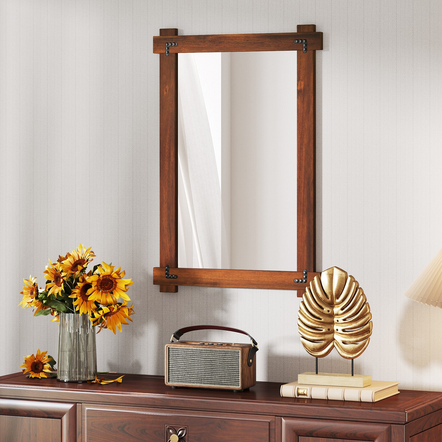 Decorative Acacia Wood Mirror with Rivet Design for Entryway and Living Room