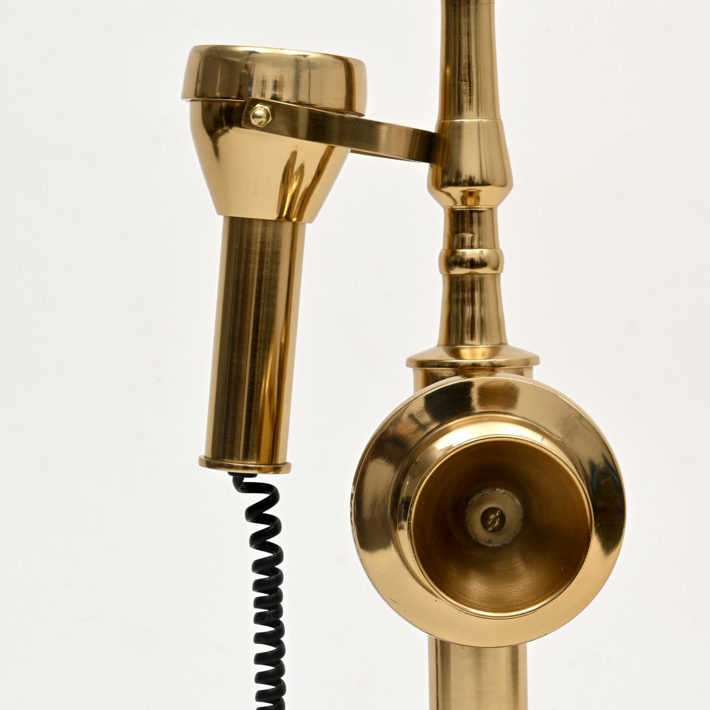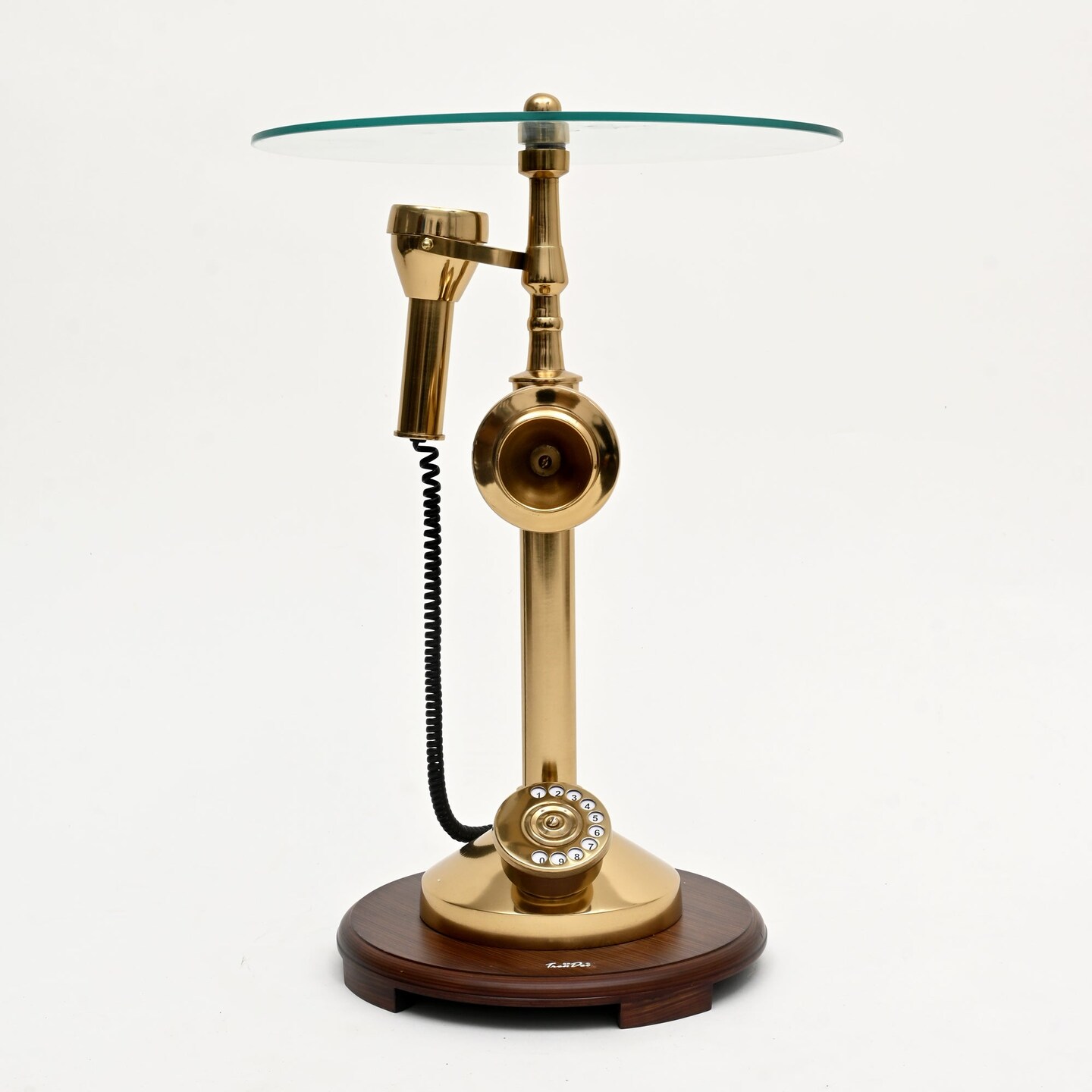 Decorative Gold Polished Aluminum Vintage Telephone Accent Table with Glass Top – 16x16x25"| Unique Side Table