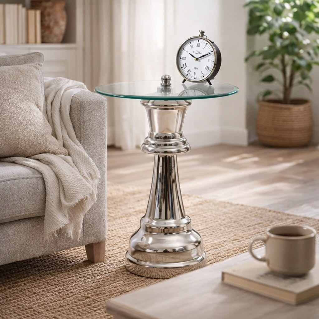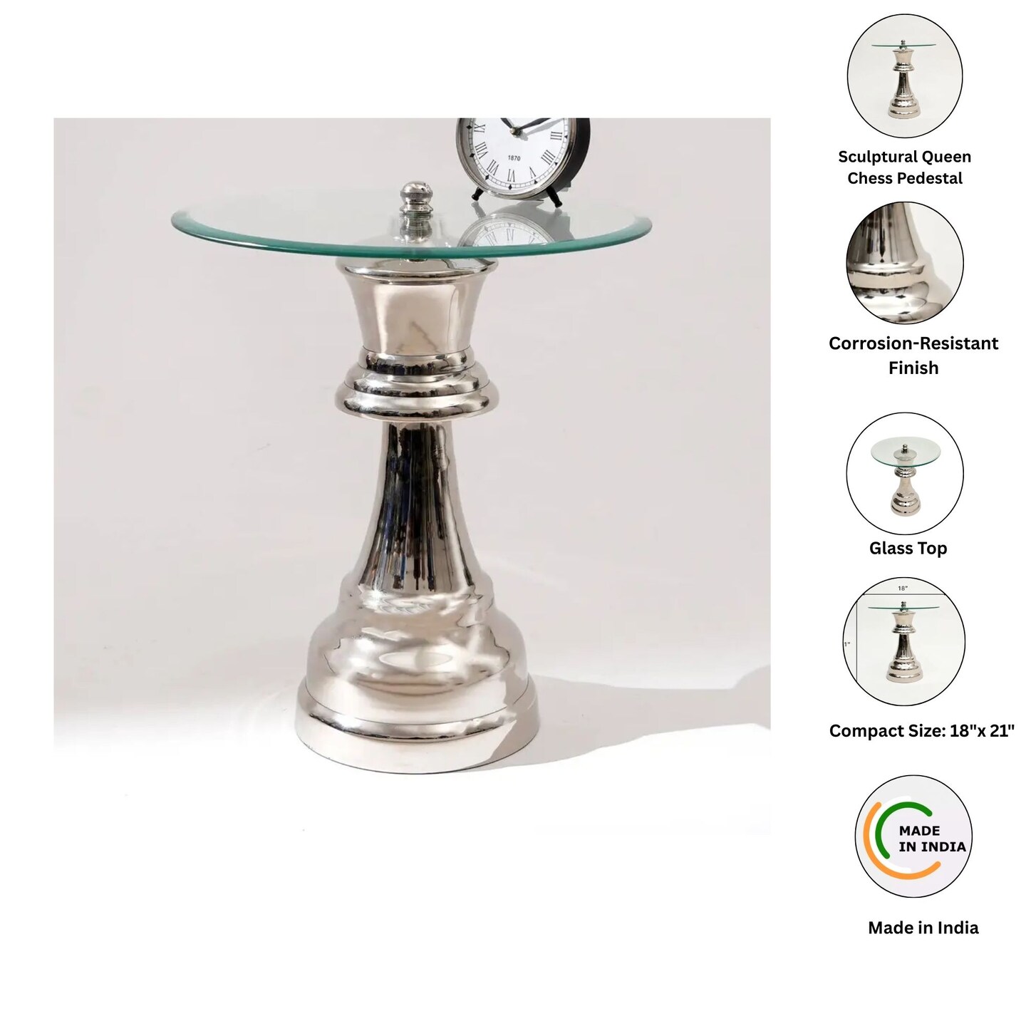 Decorative Nickel Finished Aluminum Queen Pedestal Accent Table with Glass Top – 18x18x21"| Unique Side Table