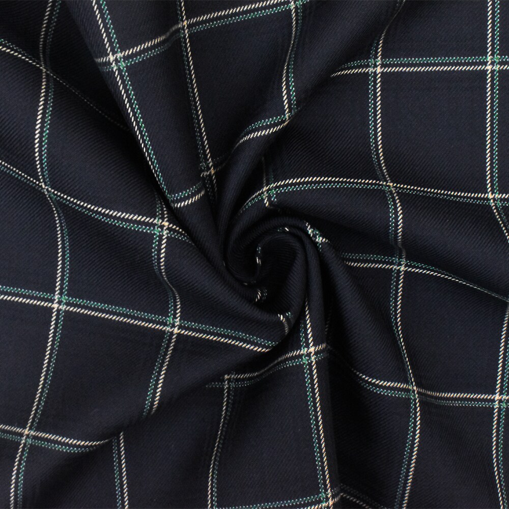 Deep Navy-Beige-Green Check Wool-Poly Twill Woven Suiting Fabric By the Yard