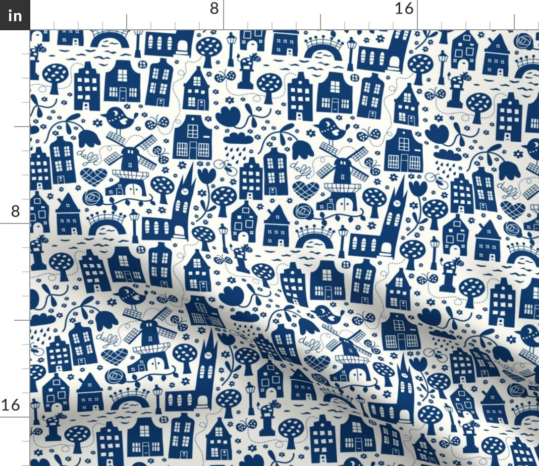 Delft Dutch Windmill Blue Folk Art Travel City Old Custom Printed Fabric by Spoonflower Various Fabrics by the Yard or Fat Quarter