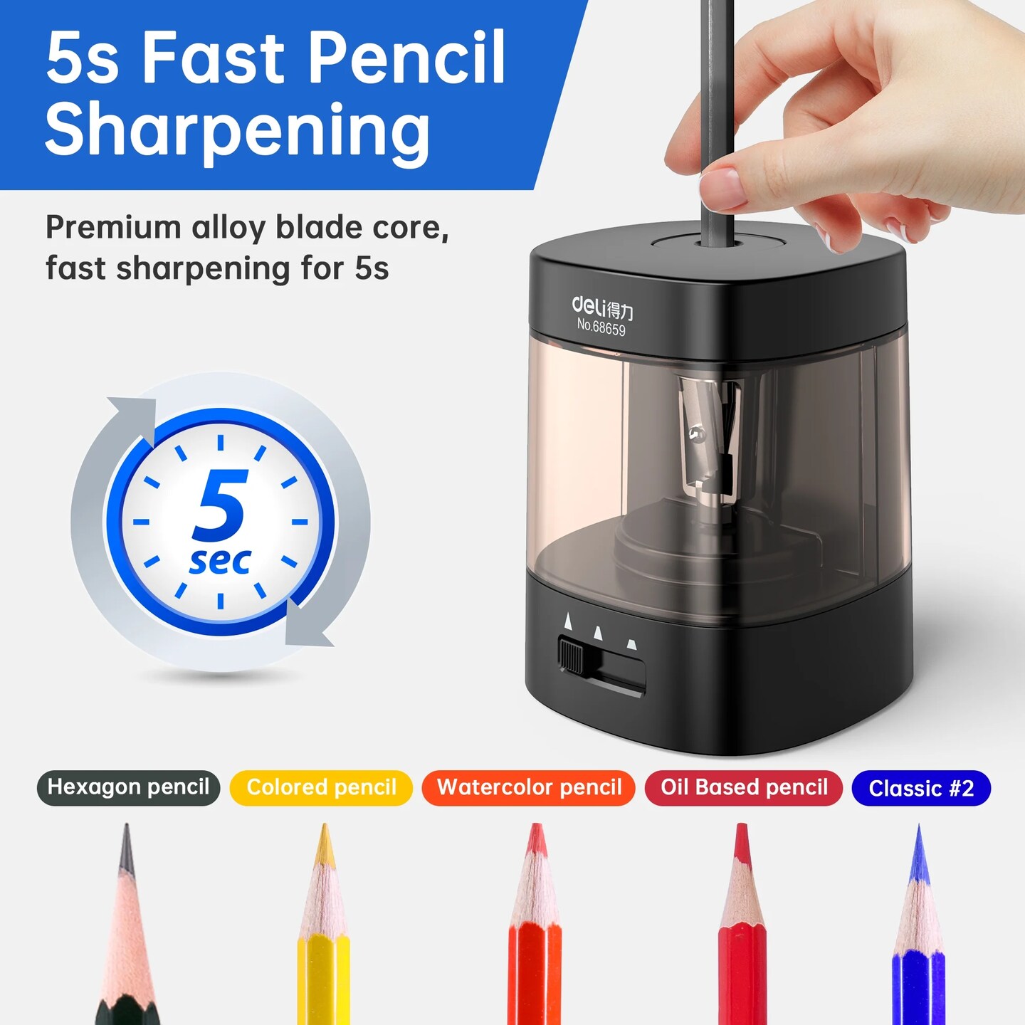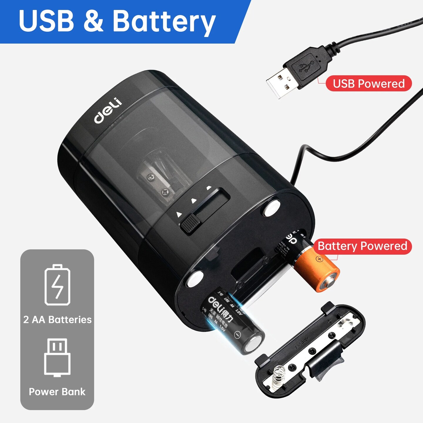 Deli Automatic Electric Pencil Sharpener – Battery & USB Powered, Adjustable Tip & Large Shavings Bin, Fast Sharpening for No.2 & Colored Pencils