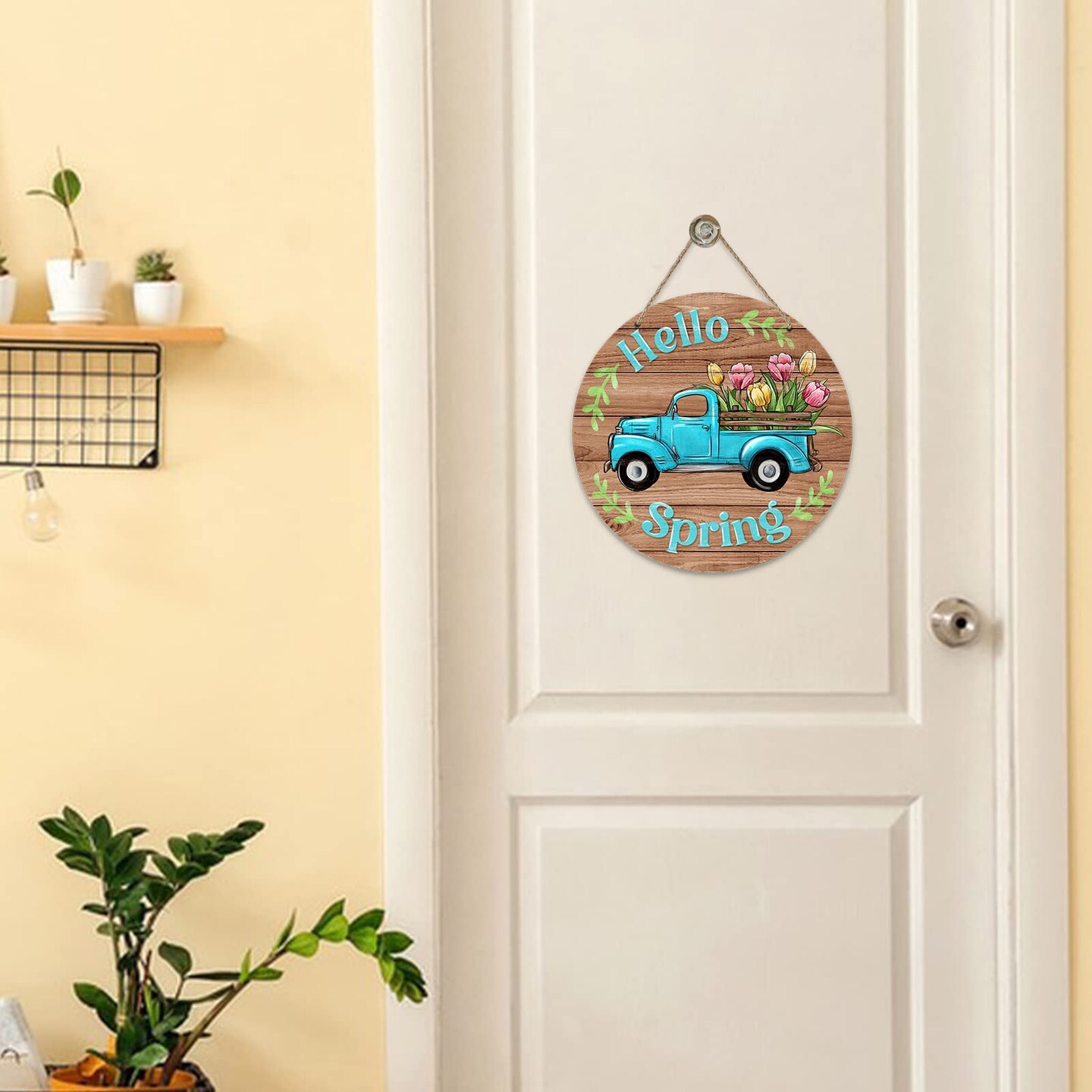 Deroro Hello Spring Blue Truck Sign for Front Door Decor, Tulip Flowers Pickup Wood Door Hanger for Outdoor Outside Porch, Rustic Farmhouse Wooden Wreath Indoor Wall Hanging Decoration