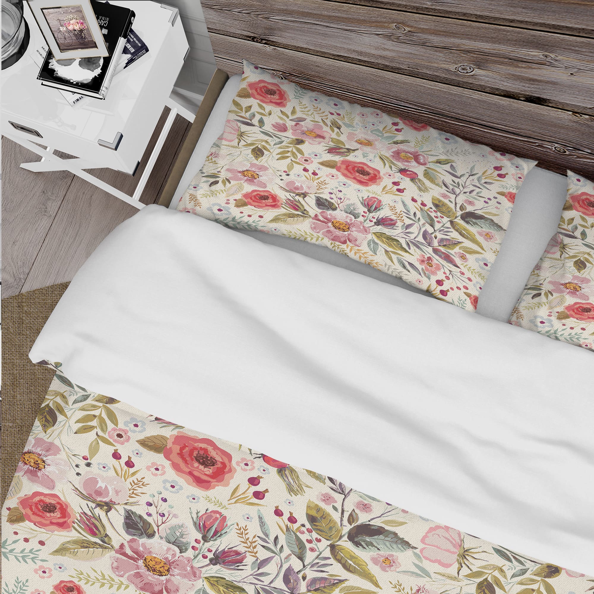 Designart 'Vintage Red Pink Flower and Leaves' Rustic Bedding Set - Duvet Cover & Shams