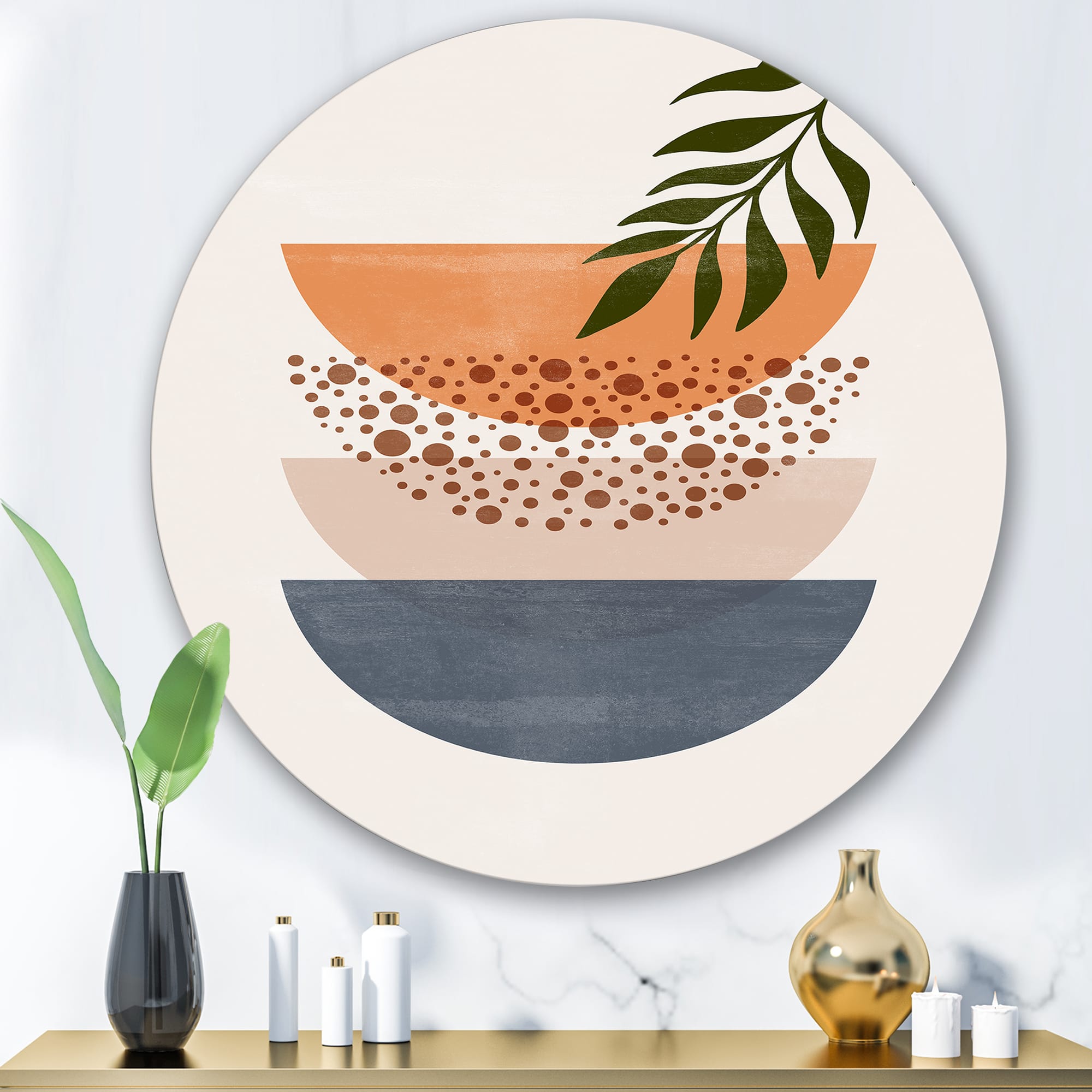 Designart - Abstract Geometrical Sun and Moon With Leaf III - Modern Metal Circle Wall Art