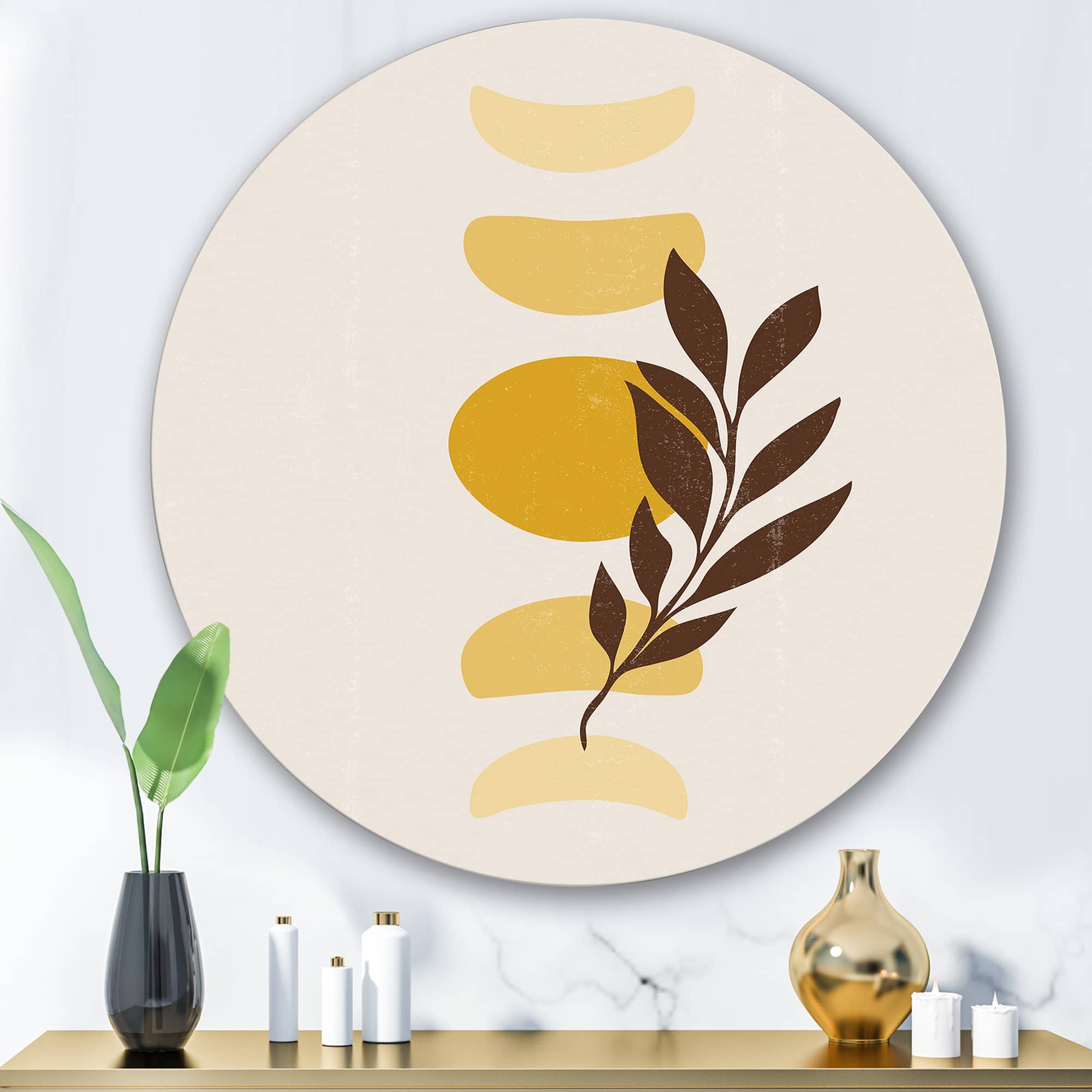 Designart - Abstract Geometrical Sun and Moon With Leaf VII - Modern Metal Circle Wall Art
