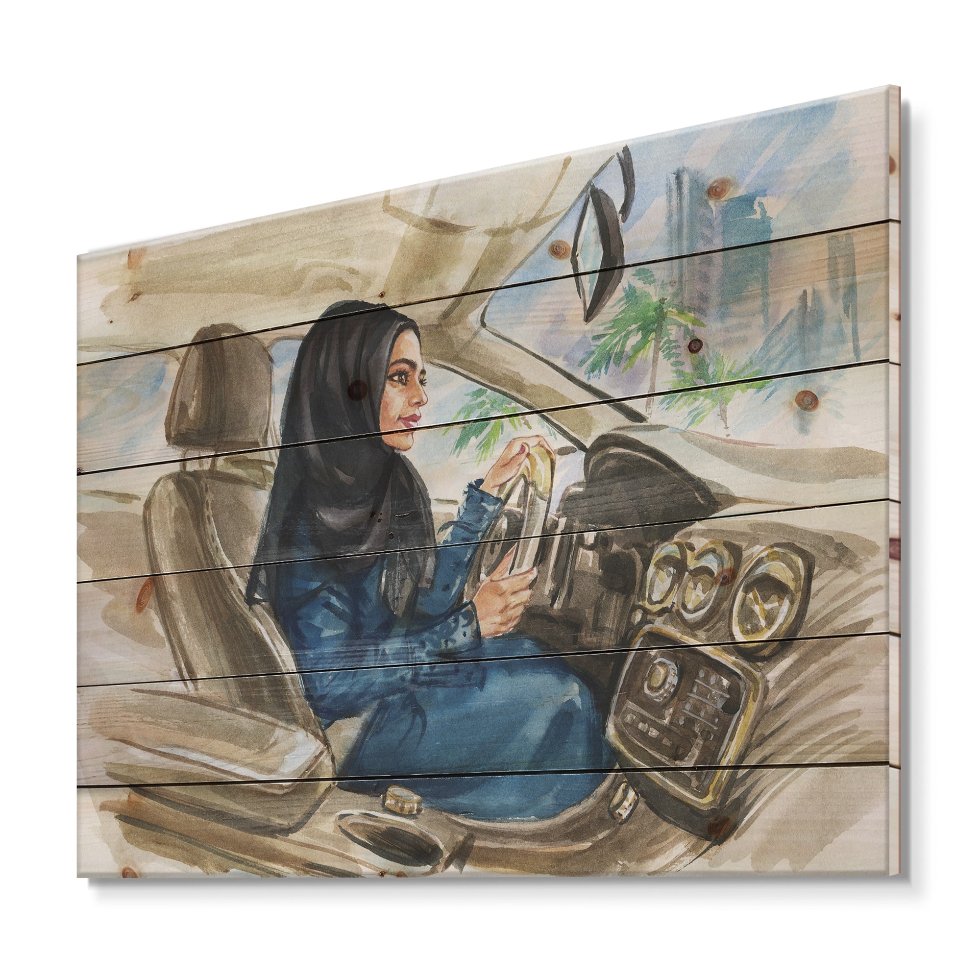 Designart - Arabian Woman Driving A Car I - Modern Print on Natural Pine Wood