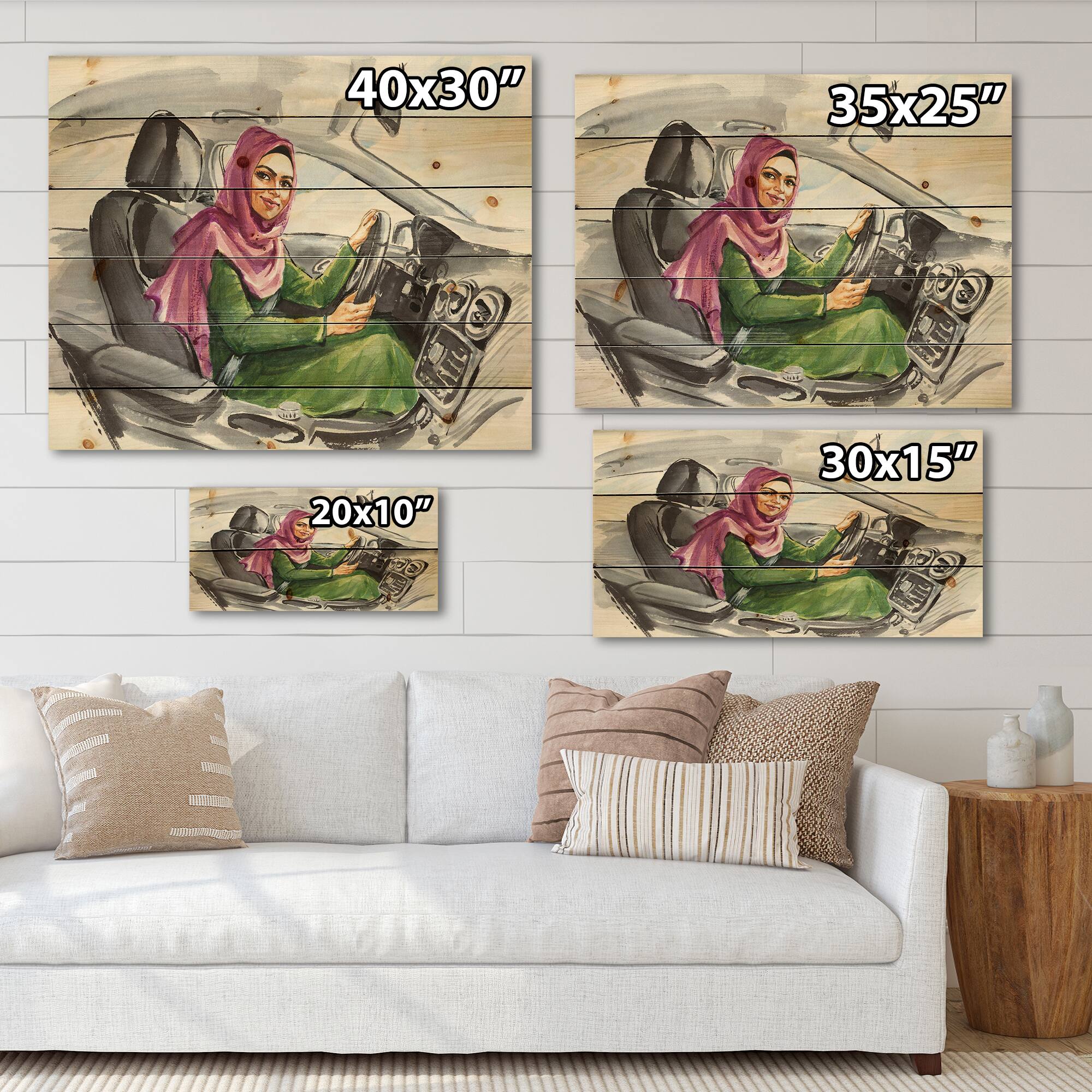 Designart - Arabian Woman Driving A Car II - Modern Print on Natural Pine Wood