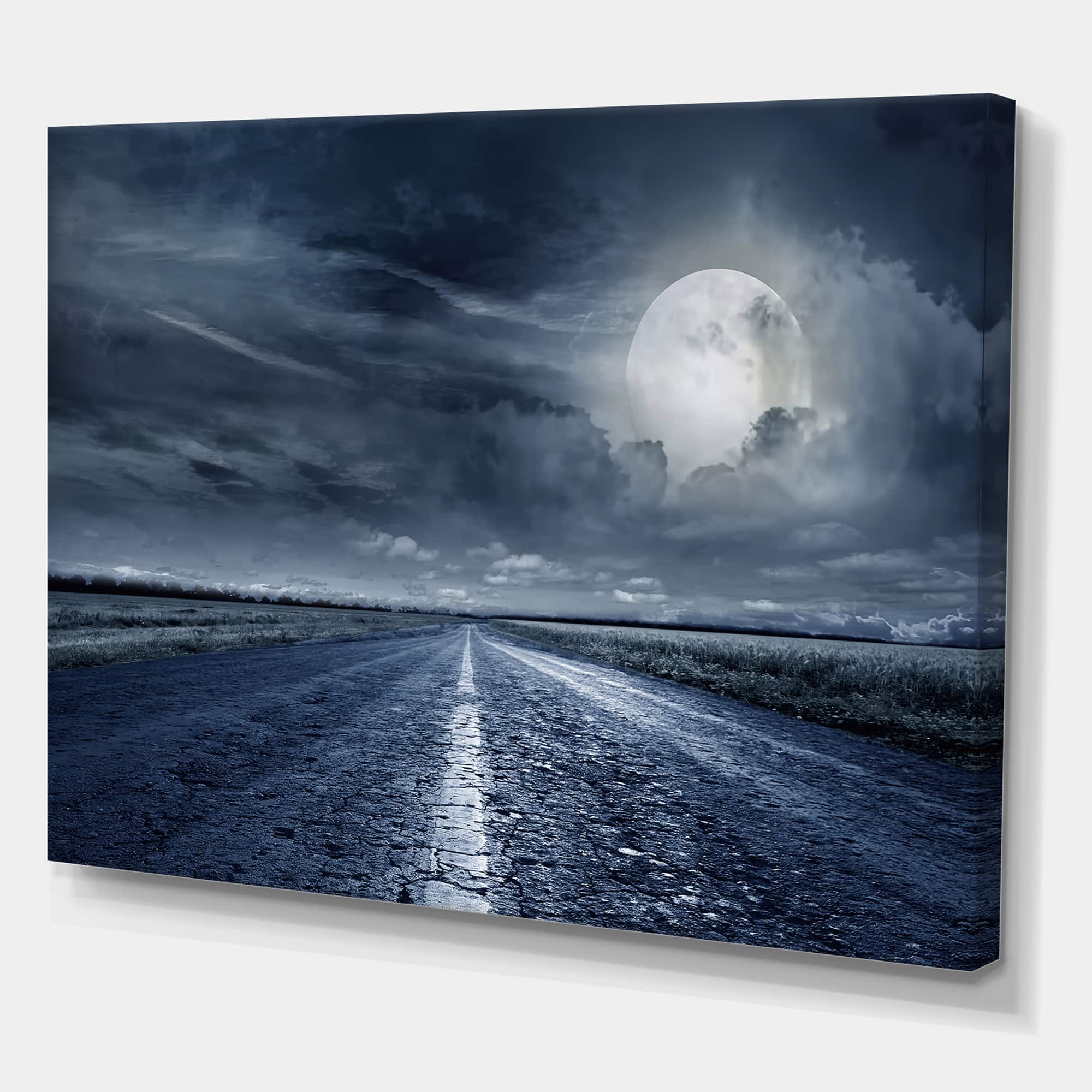 Designart - Asphalt Road Under Cloudy Full Moon II - Nautical & Coastal Canvas Wall Art Print