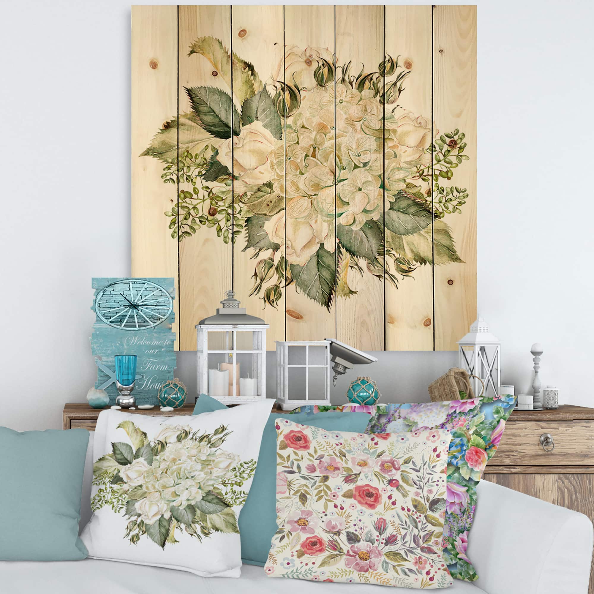 Designart - Beautiful Bouquet With Hudrangea and Roses - Farmhouse Print on Natural Pine Wood