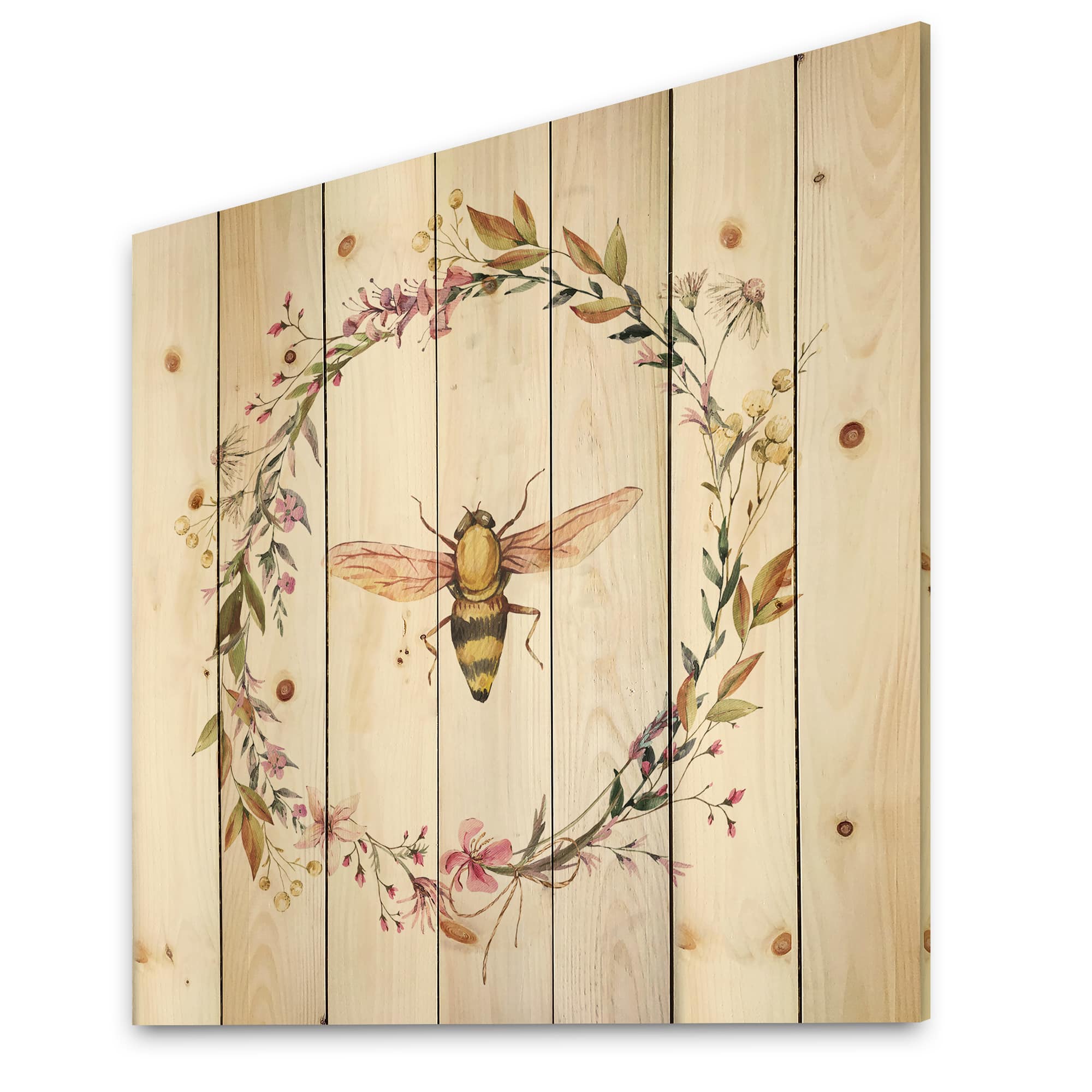 Designart - Bee In Wildflowers Wreath - Farmhouse Print on Natural Pine Wood
