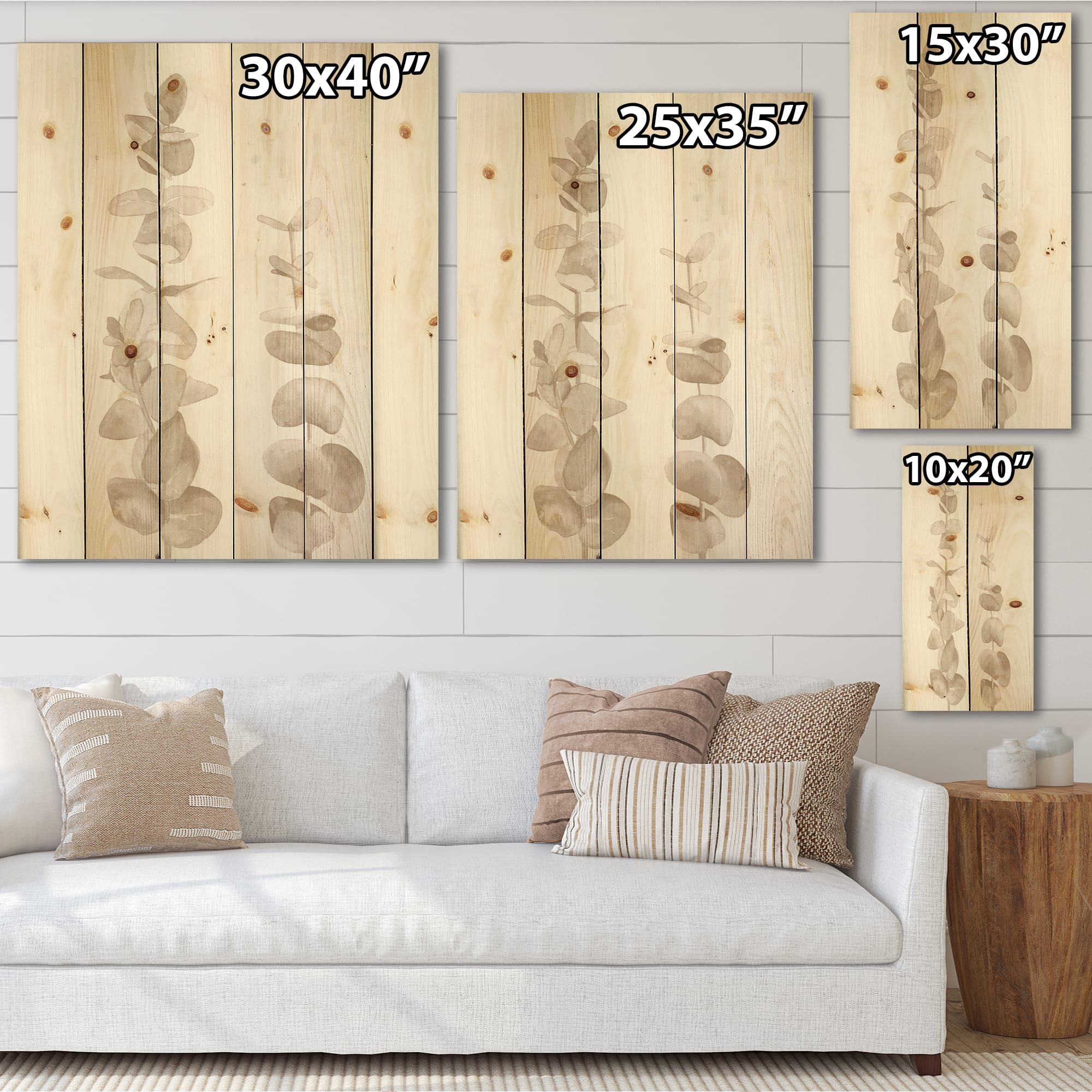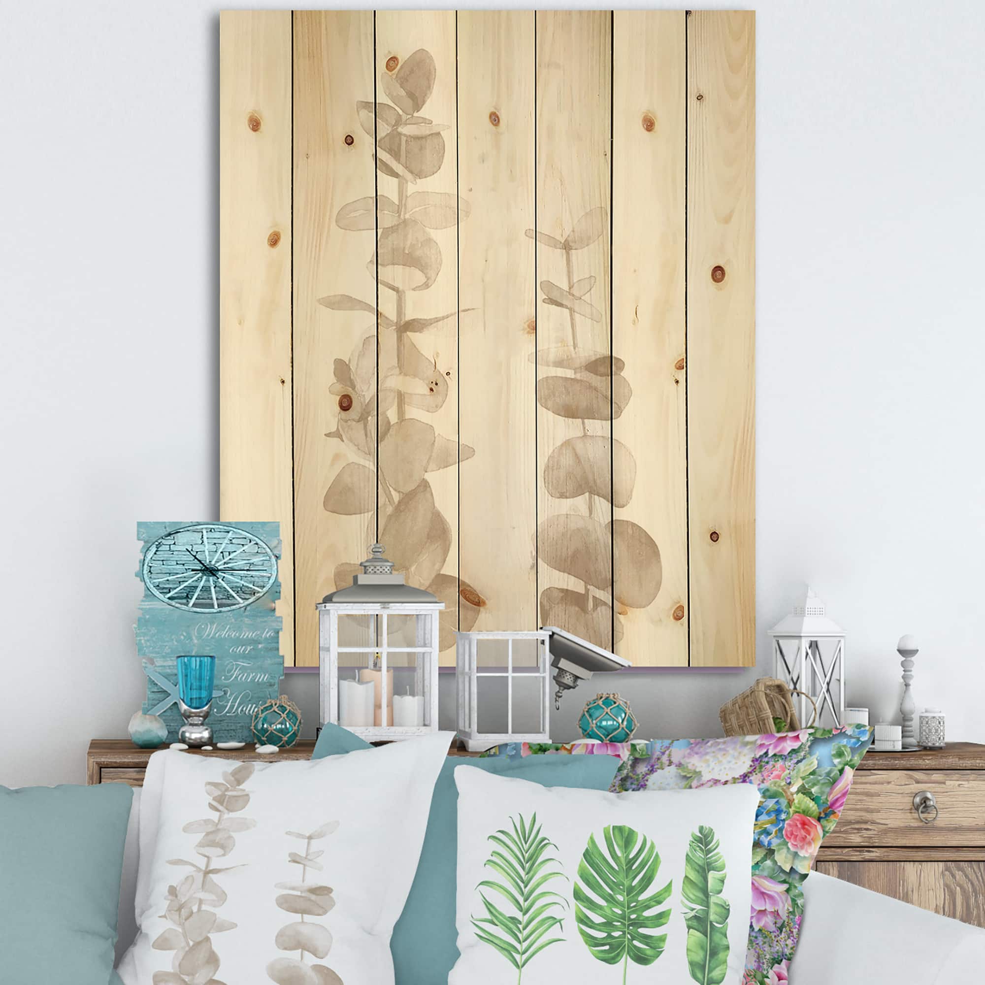 Designart - Beige Eucalyptus Branches On White - Traditional Print on Natural Pine Wood