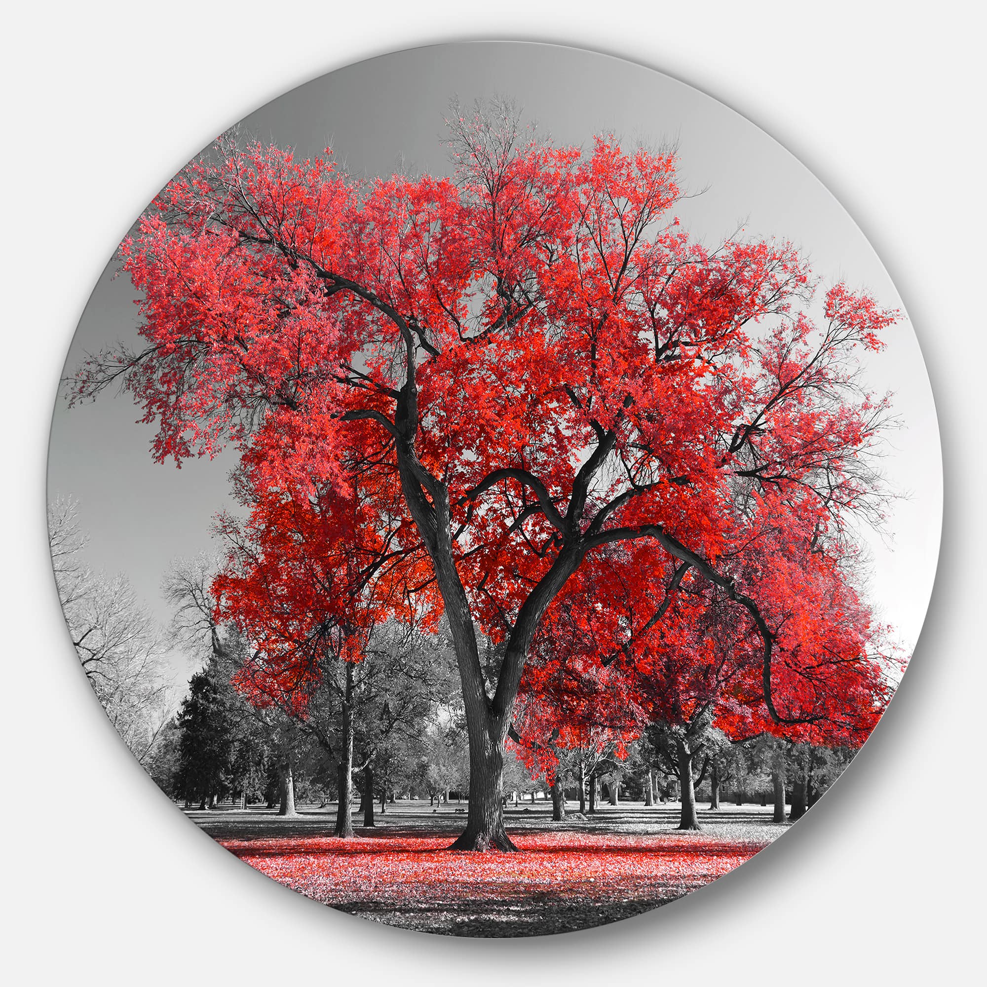 Designart - Big Red Tree on Foggy Day' Landscape Round Circle Metal Wall Art